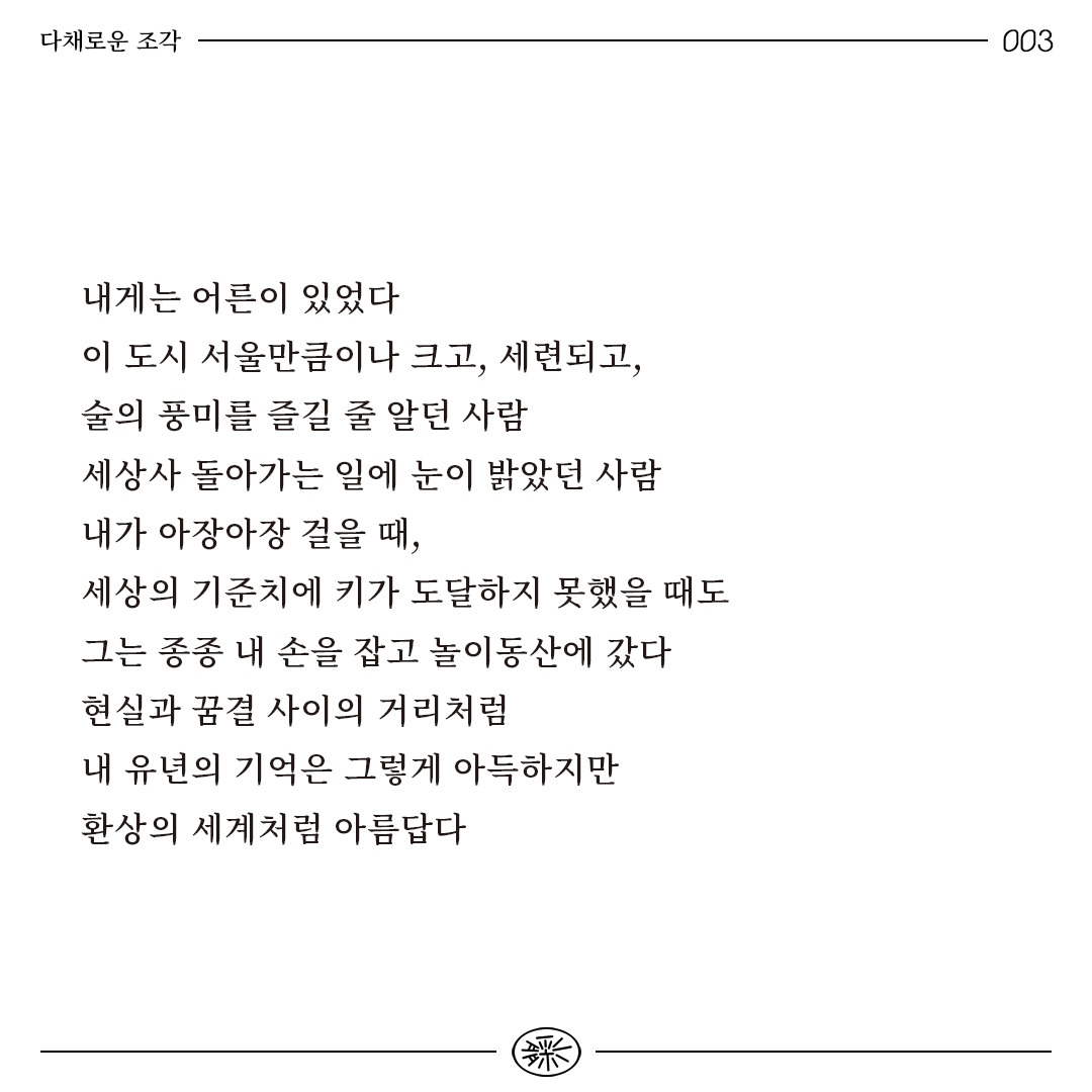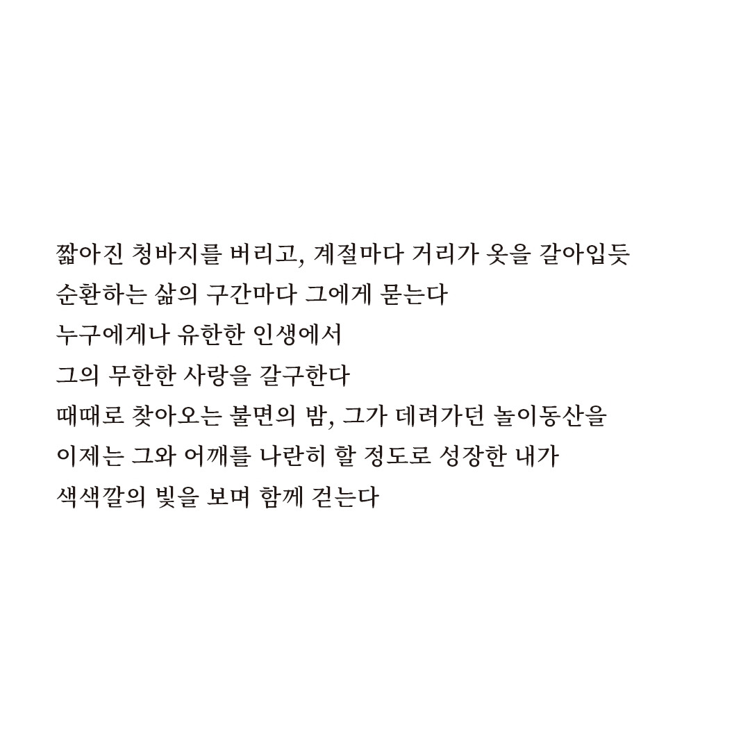 어른이 되어가는 과정 속에서 내 기억 속에 살아있는 그의 모습을 닮아가는 자신을 느끼고, 그렇게 삶은 계속되어간다는 위로 아닌 위로를 감히 건네보고 싶다.