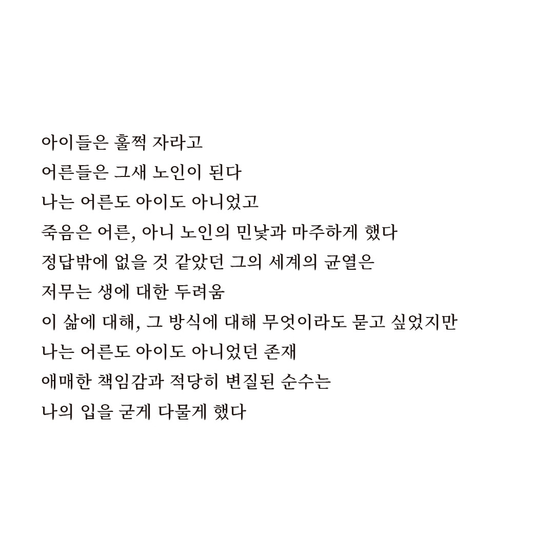 마지막 그 순간에 나에게만 그 두려움을 보이셨다. 내가 알던 나의 어른과는 너무도 다른 모습. 불면이 찾아올 때면 죽음 앞에서 약해지신 그 모습과 함께 당신에게 드릴 질문, 세상에 대한 두려움, 응원을 듣고 싶다는 투정들이 쉴 새 없이 떠올라 밤을 지새운다.