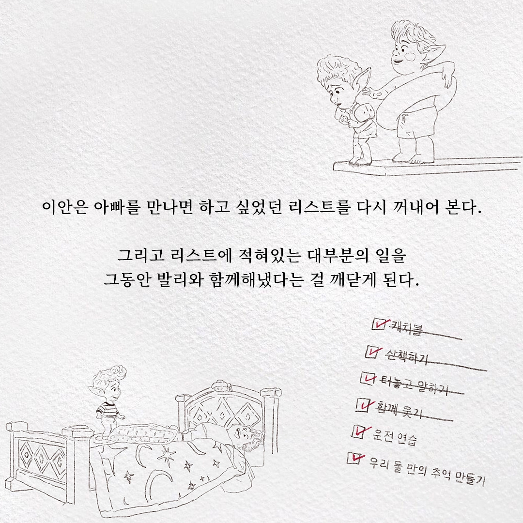 하지만 이미 채워진 항목들은 어디로 보내버린 걸까? 우리는 가지지 못한 것들을 바라기 때문에 성장하지만 이미 채워진 항목들로 인해 현재를 살아갈 수 있다. 이안은 아빠를 만나기 위해 떠나는 모험의 끝에서 결국 형과 함께했던 시간을 떠올렸고, 가장 채우고 싶었던 빈자리가 이미 채워져 있었다는 걸 알게 된다.