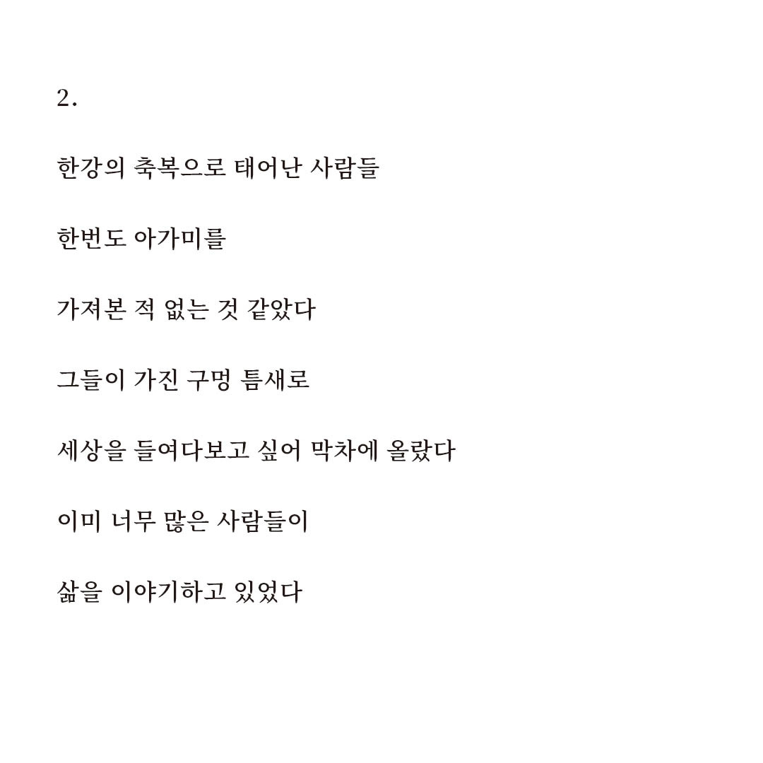 한강은 모두의 삶입니다. 여행의 명장면을 보여주다가 일상의 몇 글자를 손에 쥐어주기도 하고, 덧없음의 끝에 무엇이 있을지 다시 한번 질문합니다. 어쩌다 가끔 눈물겹게 아름다운 한강일 때면 손에 들고 있는 조각이 꽃다발인 경우가 있습니다. 그럴 때 다시 숨을 크게 한번 들이쉽니다. 지금 손에 들고 있는 조각이 무엇이든 살아갈 수 있는 단서가 되었으면 좋겠습니다. 빛을 희망이라고만 읽지 않는 사람이 되었을 때 다채의 조각을 접한다면, 이 몇 글자의 시가 다정한 위로의 꽃으로 피어나기를 바랍니다.