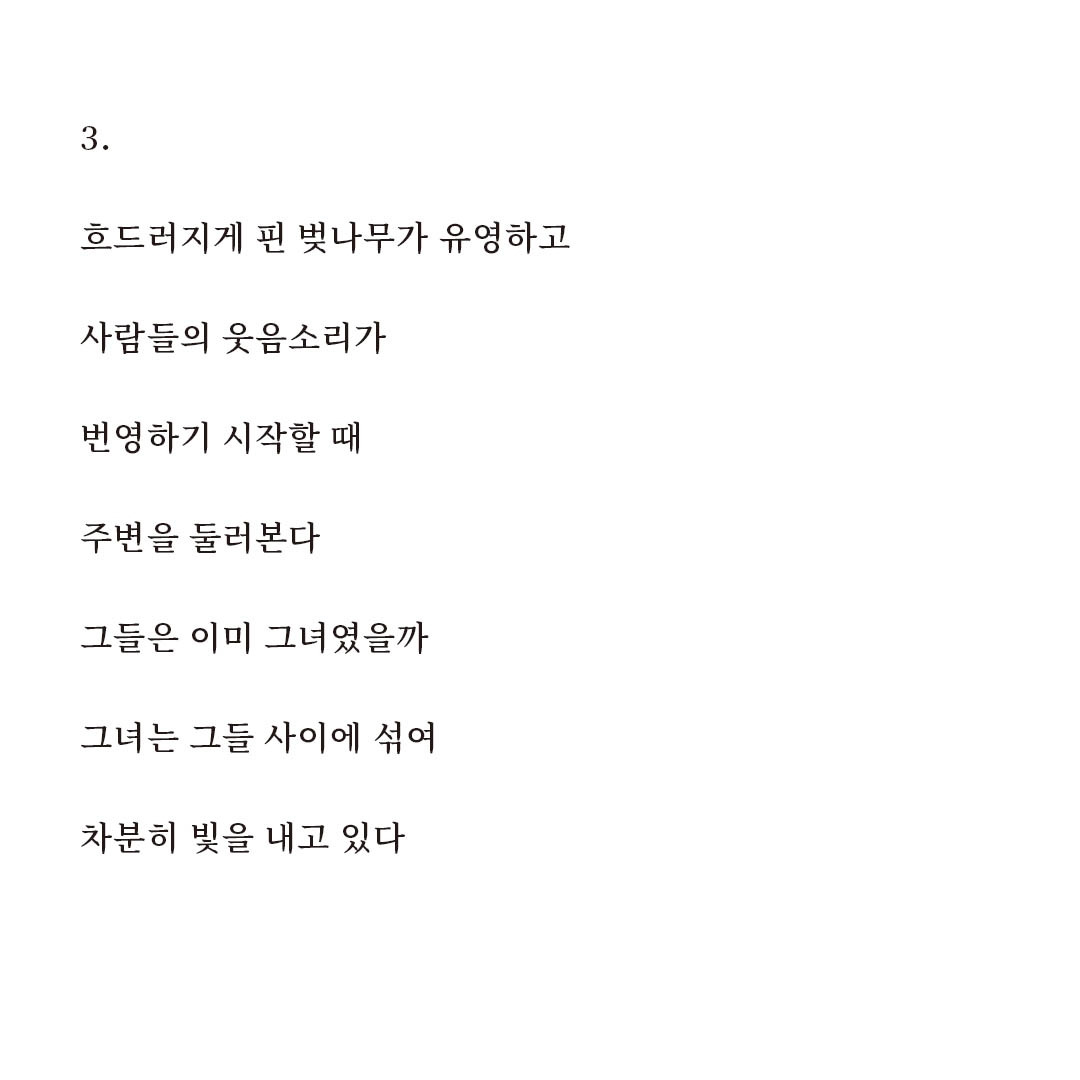 시간이 흐른 만큼 변했다고 여겼지만, 여전히 두려움이 앞서고 그다음 걸음을 주저하게 됩니다. 성장하지 못한 제 모습이 유독 실망스러웠던 날도 있었습니다. 삶이 슬럼프로 향하던 순간에 그녀의 사연을 만나게 되었고, 희망의 단서인 다채의 행보와 함께할 수 있었습니다. 사연 속 순간순간의 장면에 저의 절망과 두려움이 보였기에 시를 기록하는 매 순간이 막중한 책임감으로 다가왔습니다.