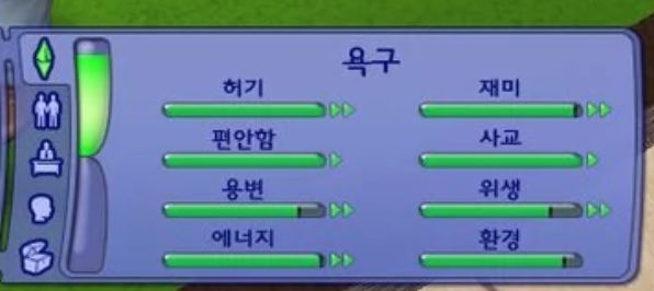 심즈 안에서 내 캐릭터를 데리고 파티에 가고 학교도 가고 재밌는 것들을 하며 시간을 보내다보면, 정말 금방 여러가지 욕구들이 바닥이나곤 했다.