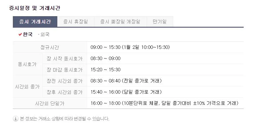 네이버 검색 결과를 보면 정규 시간 외 다른 여러 가지 거래 방식들이 나와있다. 동시호가에는 장 시작 동시호가(8:30 ~ 9:00)와 장 마감 동시호가(15:20 ~ 15:30)가 있다. 지정된 시간 동안 들어오는 모든 주문을 합쳐서 한 번에 체결시키는 것이 동시호가 거래다. 매수와 매도 주문이 가장 많이 겹치는 가격으로 체결되며, 장 시작 동시호가로 결정된 가격이 그 날의 시가, 장 마감 동시호가로 체결된 가격이 그 날의 종가가 된다. 장 마감의 경우 오후 3시 20분부터 동시호가에 들어가 주문을 모아서 한 번에 체결해야 하므로, 3시 20분이 되면 호가창이 움직이지 않는 모습을 볼 수 있다.