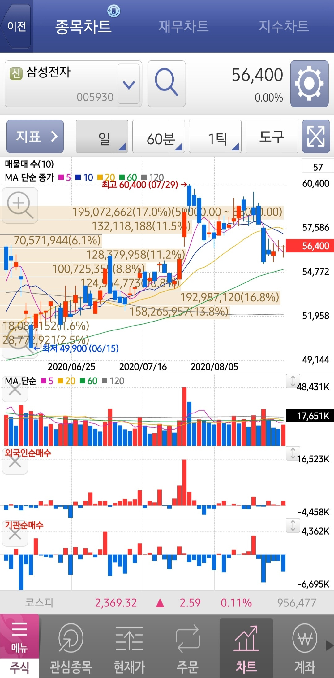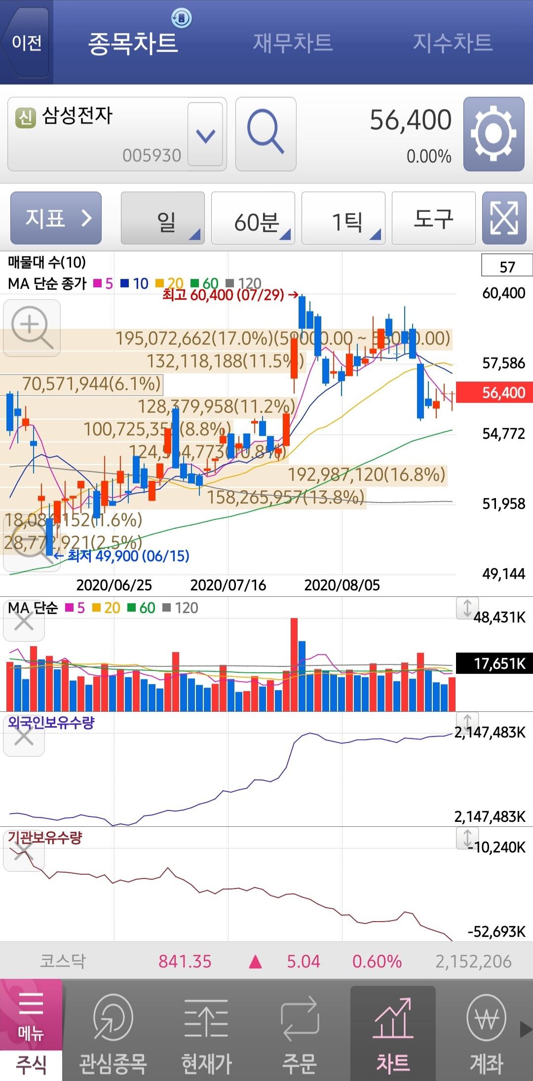 차트를 통해서도 외국인과 기관의 해당 종목 보유수량 또는 순매수량을 확인할 수 있다.