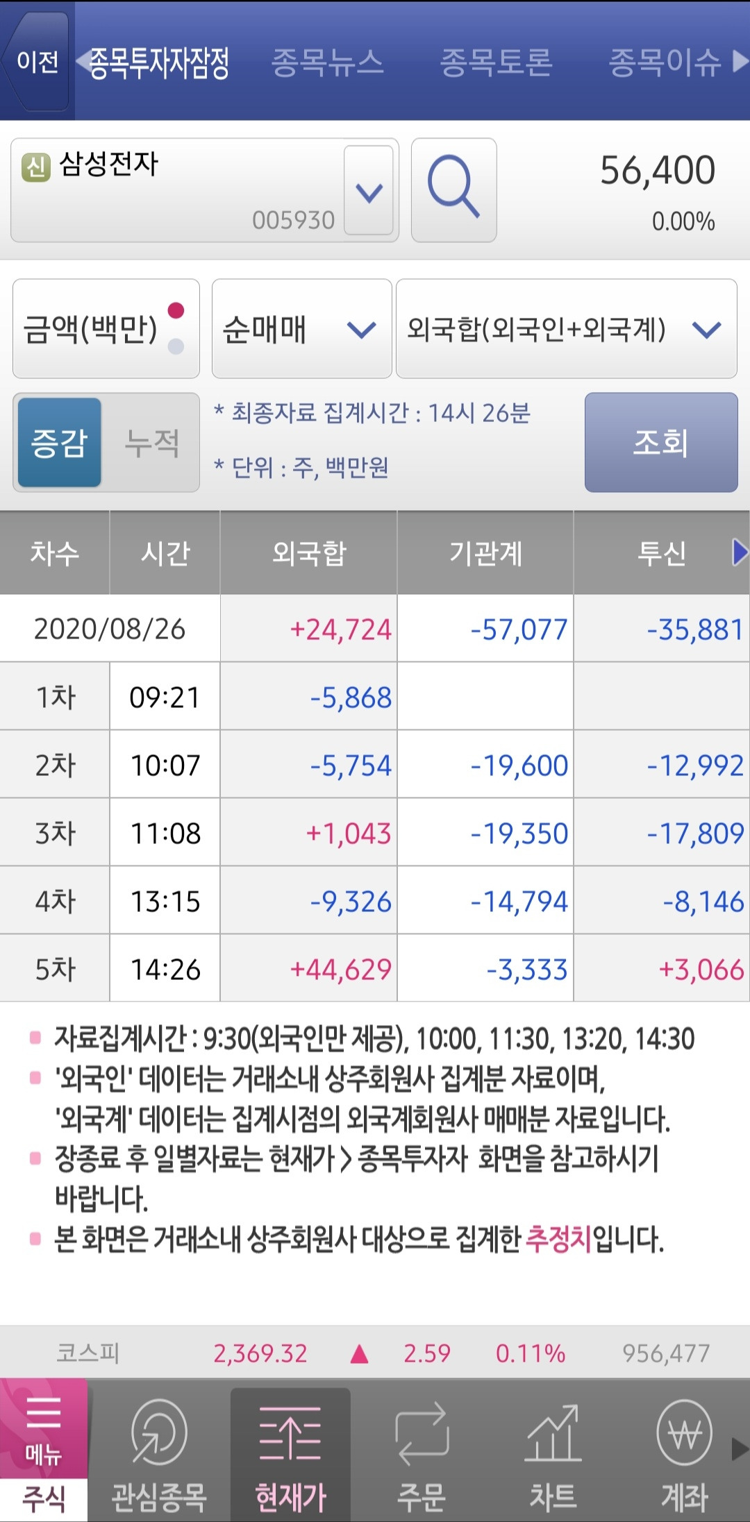 왼쪽 종목투자자잠정, 오른쪽 종목투자자 (주식 어플 영웅문S 캡처) - 종목투자자잠정: 당일 시간대별로 외국인과 기관의 거래 현황을 잠정치(추정치)로 보여준다.