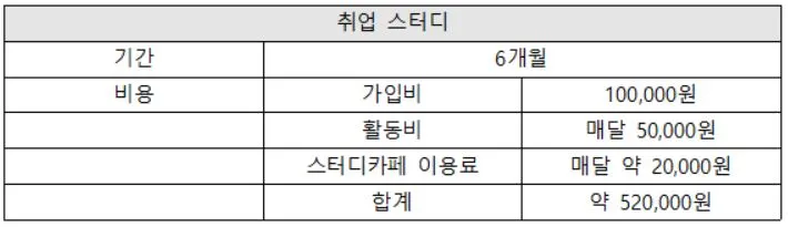 취업스터디를 하는 데에도 학생으로서는 만만치 않은 비용이 들어갔다. 해당 스터디의 경우 가입비가 10만 원, 그 외 별도로 매 달 5만 원을 내야 했다. 이 비용은 스터디의 회원 자격을 유지하는 것일 뿐, 스터디 카페를 이용하거나 취업 관련 강의를 들으려면 별도의 이용료를 추가로 지불해야 했다. 그나마 나는 취업스터디에 들어간 이후 약 반년 정도 다니다가 첫 직장을 구하게 되어 다른 사람들에 비해 지불 총액이 적은 편이었다. 강의나 다른 모임에 참여해보면 스터디를 한 지 1년 이상, 2년이 넘게 하고 있는 분들도 많았다.