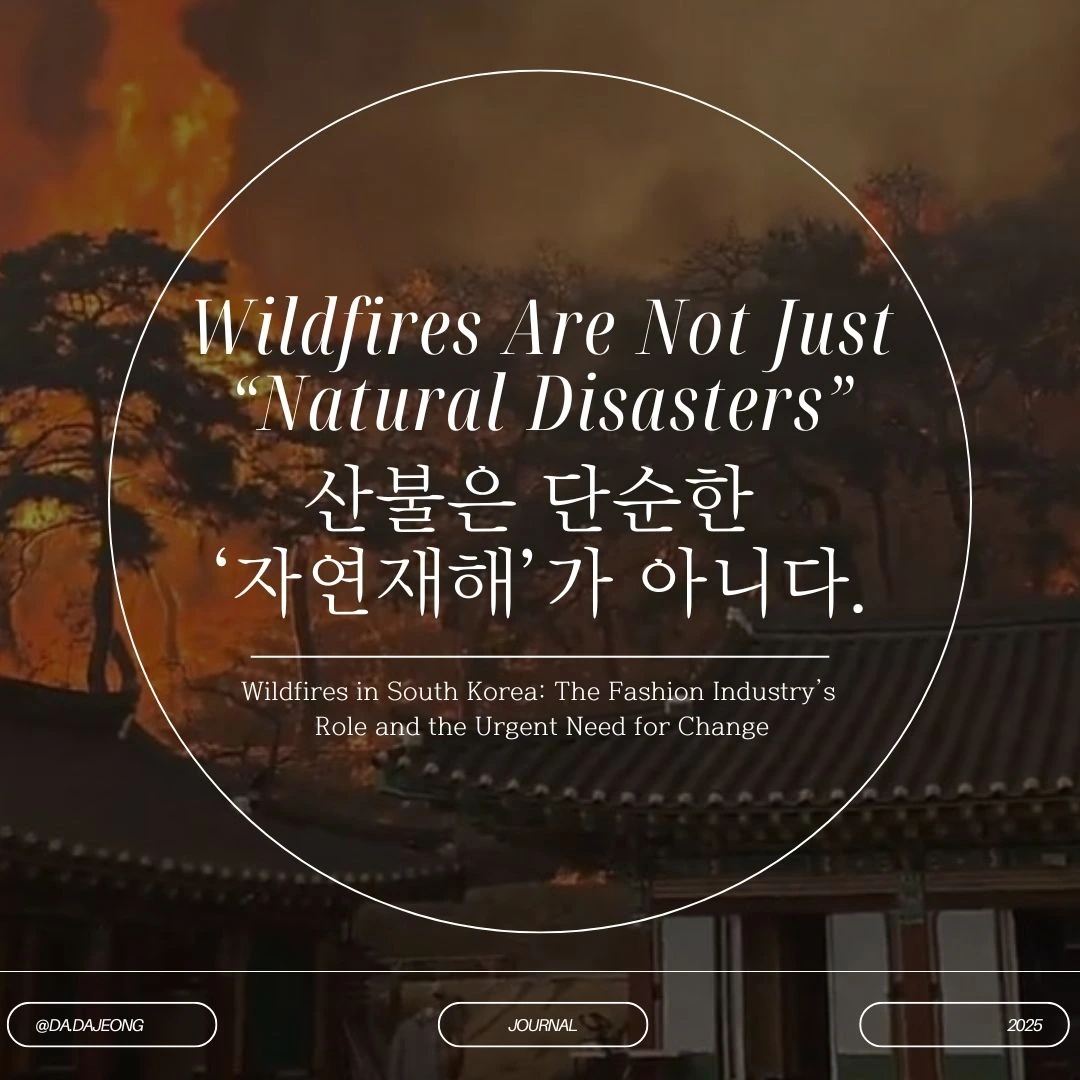 패션 산업은 단순히 옷을 생산하는 행위가 아니라, 그 과정에서 환경을 파괴하고, 삼림 파괴, 탄소 배출, 자원 고갈 등을 통해 산불 위험을 키우는 주요 원인으로 산불이 번질 수 있는 조건을 만들어내고 있다.