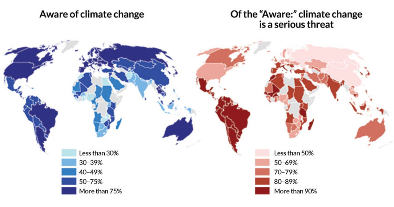 위 선진국 사람들은 일반적으로 기후 변화에 대해 더 큰 인식을 가지고 있지만 (오른쪽), 개발도상국의 공동체의 사람들은 기후 변화의 인식이 아닌 그 위협을 걱정한다 (왼쪽).