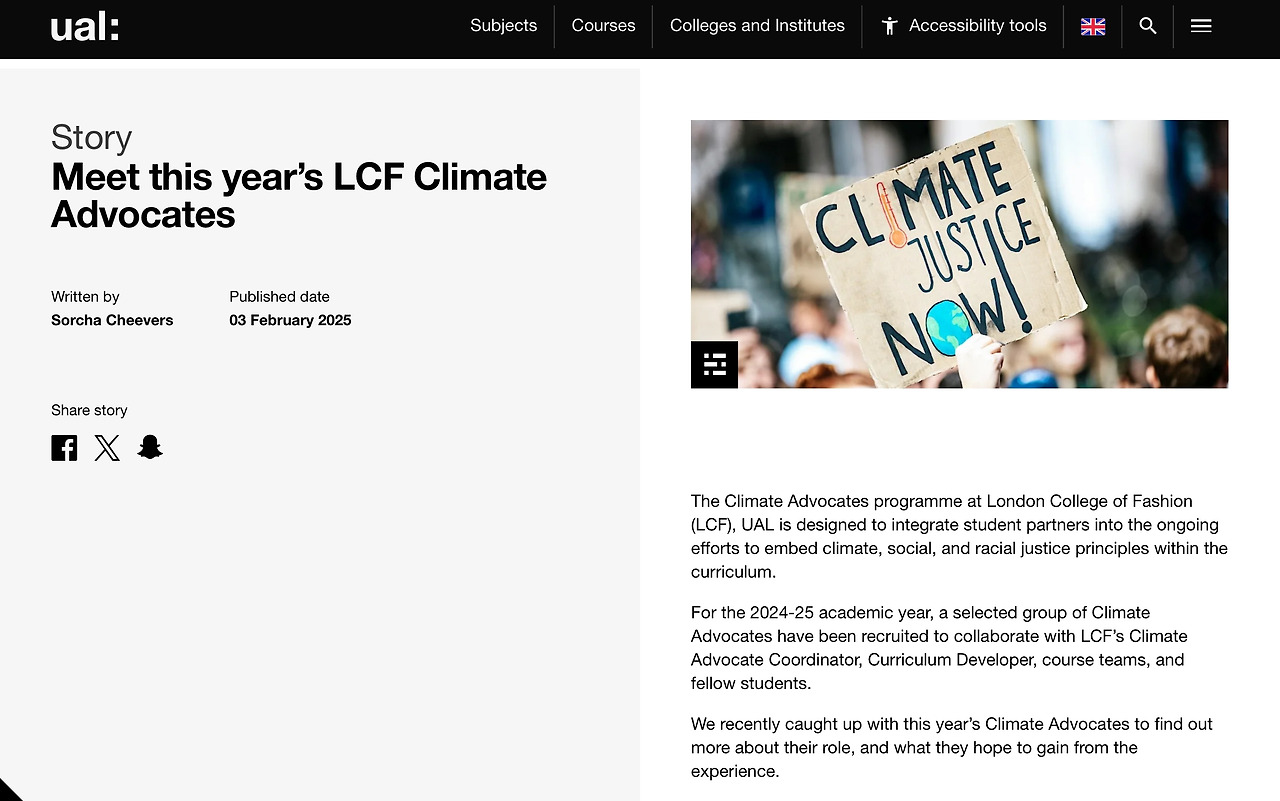 University of the Arts London (UAL)에서는 각 단과대학 (LCF, Central Saint Martins, Chelsea College of Arts 등) 마다 Climate Advocate를 선발한다.