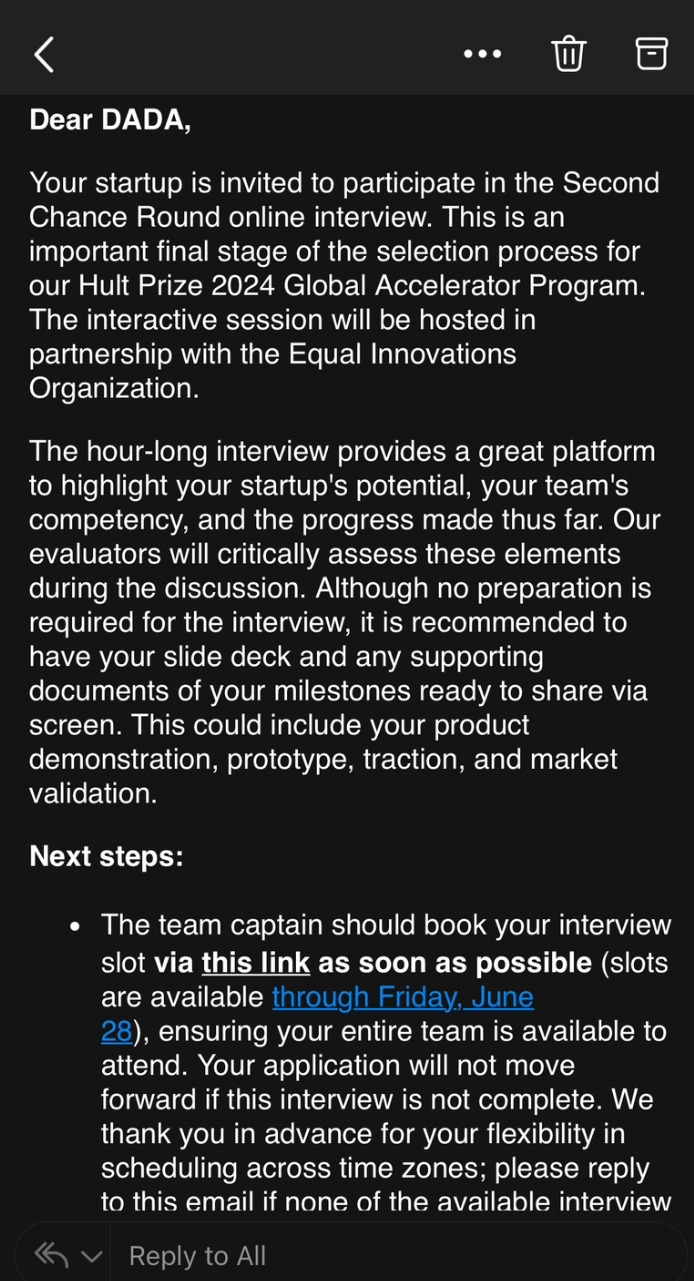 영국으로 돌아온 우리는 보스턴 서밋을 값진 경험으로 간직한 채, 곧바로 MESO 프로젝트 마감을 앞두고 눈코 뜰 새 없이 바쁜 나날을 보내고 있었다. 그러던 중, 뜻밖의 소식이 전해졌다. ‘다다’가 패자부활전 기회를 얻어 온라인 인터뷰에 초청된 것이다. 프로젝트 마감이 코앞이라 여건은 빠듯했지만, 런던에서 열릴 액셀러레이터 프로그램은 놓칠 수 없는 기회였다.