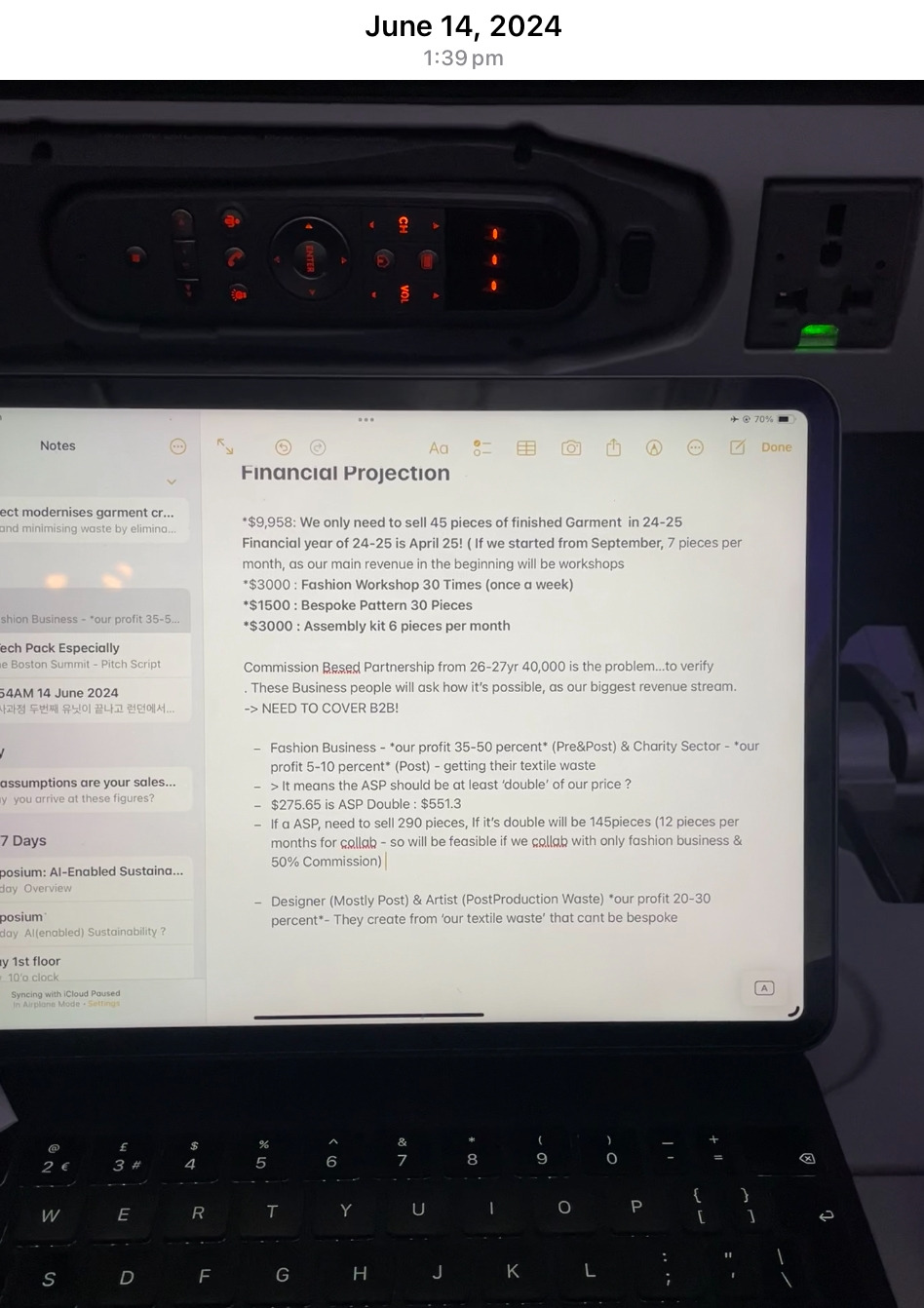 이처럼 복잡한 비즈니스 아이디어를 비즈니스 계획서, 4분 피치 영상, 최대 10장으로 제한된 비즈니스 덱(Deck) 등 간략한 제출 양식으로 짧은 시간 내에 완성하는 것은 결코 쉽지 않은 일이었다. 각자의 강점을 활용해 이 난관을 헤쳐나갔다. 프로젝트의 핵심인 의류 제작 및 프로토타이핑은 MESO 프로젝트의 연장선상에 있었기 때문에 내가 주로 진행했지만, 팀원들이 각자의 강점으로 프로젝트에 기여하는 부분은 분명했다.