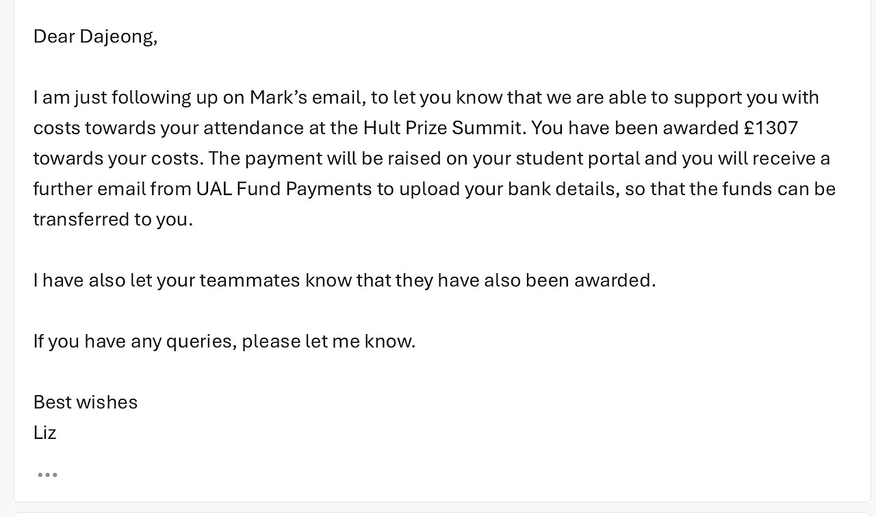 그러나 기쁨도 잠시, Hult Prize는 참가 경비 지원이 없다는 사실을 알게 되었다. 게다가 인도 국적의 Radhika는 비자를 받지 못해 결국 서밋에 동행할 수 없었다. 런던에서 보스턴까지 남은 네 명의 경비를 마련하는 것은 막막한 과제였다. 나는 튜터들에게 도움을 요청했고 그들은 Global Pathway 펀딩을 신청할 것을 권고했다. Global Pathway는 학생들이 학업과 관련된 국제적인 경험을 쌓을 수 있도록 지원하는 프로그램으로, 보통 여행 경비나 참가비 등을 보조한다. 이미 마감일이 지났음에도 나의 사정을 길게 설명하는 이메일을 보냈고, 다행히 일부 금액을 지원받을 수 있었다. 하지만 그 금액으로는 전원 경비를 충당하기에 역부족이었다.