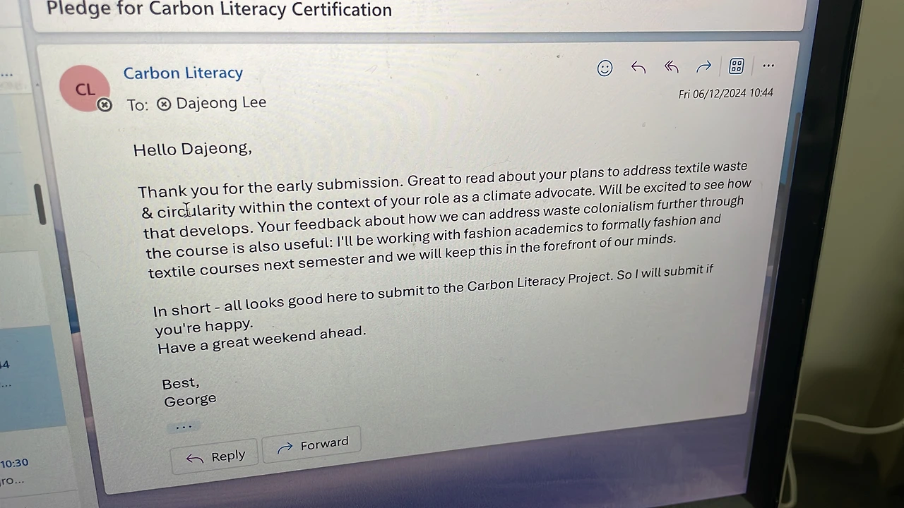 Carbon Literacy Certificate 를 위한 서류를 제출한 뒤, George로부터 따뜻한 회신을 받았다.