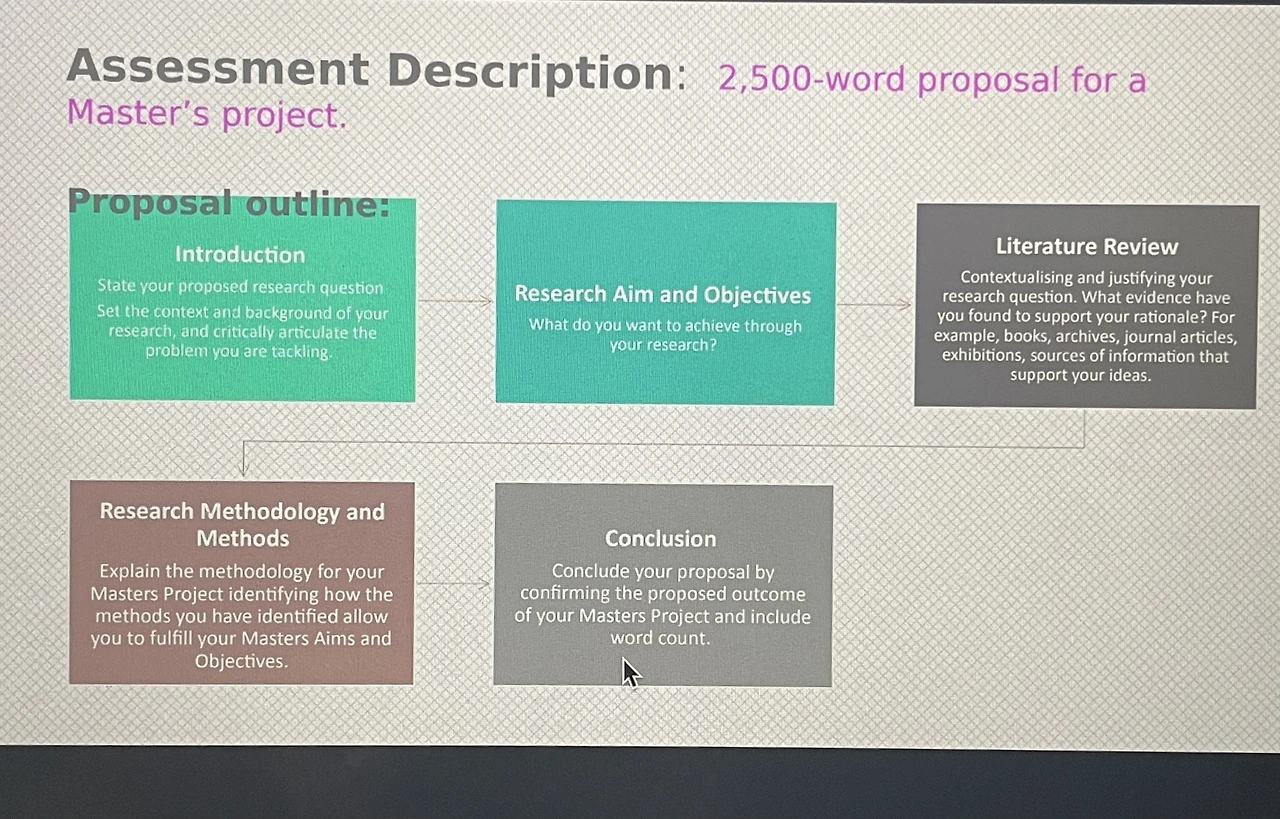 LCF Fashion Futures에서 요구하는 Research Proposal은 2,500 단어 분량의 마스터 프로젝트 설계 문서로, 무엇을 만들 것인가 보다 어떤 연구를, 왜, 어떻게 수행할 것인가를 명확히 설명하는 데 목적이 있다.
