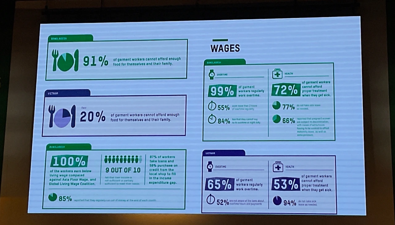 방글라데시의 경우, 의류 노동자의 91%가 자신과 가족을 위한 충분한 식량을 감당하지 못하고 있으며, 베트남에서도 20%의 노동자가 기본적인 식비조차 충족하지 못하는 상황에 놓여 있다. 이러한 임금 부족은 곧 과로로 이어진다. 방글라데시에서는 의류 노동자의 99%가 상시 초과근무를 하고, 그중 84%는 초과근무를 거절할 수 없다고 답했다. 베트남 역시 65%가 정기적으로 초과근무를 하고 있으며, 절반 이상이 초과근무 시간과 수당에 대해 정확히 알지 못한다고 응답했다. 건강은 더욱 직접적인 지표다. 방글라데시 노동자의 72%, 베트남 노동자의 53%는 아플 때 적절한 치료를 받을 경제적 여유가 없다고 답했다. 그럼에도 불구하고 대부분은 병가를 쓰지 못하거나, 임금 삭감을 감수하며 일터에 나온다.