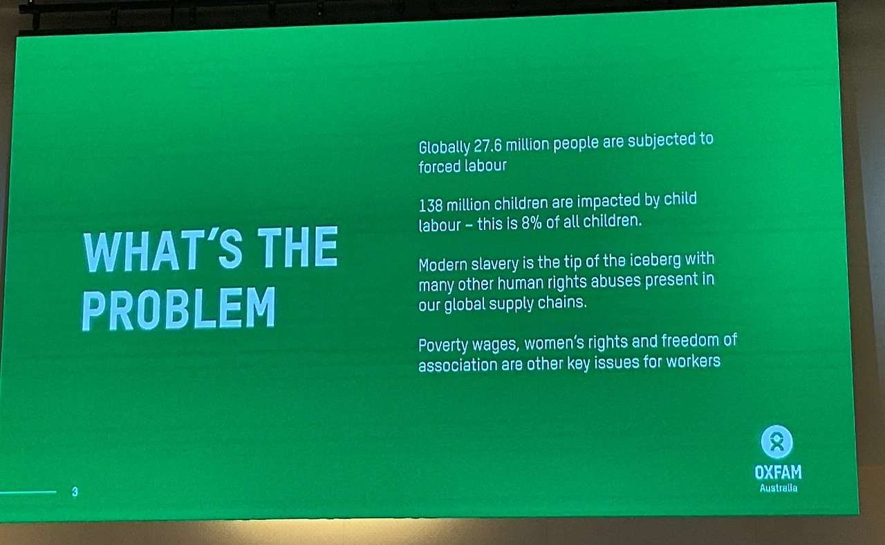 두 번째 발표자인 Nina Crawley(Oxfam Australia)는 패션 산업의 임금·고충·구제 중심의 실무 프레임을 소개했다. 그녀는 먼저 임금이 부족할 때 노동자의 삶이 어떻게 붕괴되는지를 구체적인 데이터로 보여주었다.