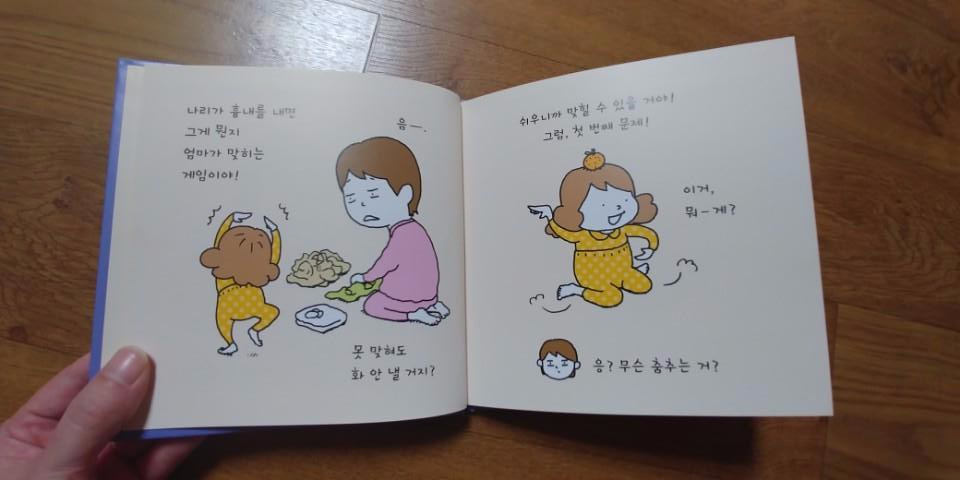 오랜만에 그림책 가지고 하는 놀이. 실제 책의 내용도 그렇다. 누리가 몸동작으로 퀴즈를 내면 엄마가 그걸 맞히는 거다. 평소 "아빠는 지구만큼 좋아하고, 엄마는 개미 똥만큼 좋다"는 둘째가 오랜만에 아빠가 아닌 나에게 먼저 놀이를 제안해서 그랬는지 내가 더 신났다. 이 참에 점수 좀 따 보자 싶었던 것.