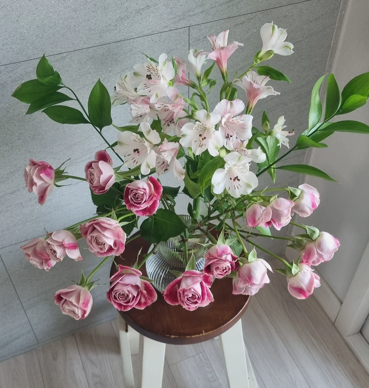 가게에 가니 마침 그날 새벽시장에서 꽃을 사 오셨다는 사장님. 집에서 꽂을 거라고 하니 "만원 어치 줄까요?" 하시기에 "음... 만 오천 원어치 주세요" 했다. "집에서 꽃을 거면 그래도 좀 오래 볼 수 있는 녀석들로 알아서 다발로 만들어 주겠다"고 하셨다. 원래는 비싼 아이인데 오늘 싸게 들여왔다고 미니장미를 풍성하게 넣으시고 나리꽃 비슷하게 생긴 알스트로메리아도 한 줄기, 버터플라이 라넌큘러스도 넣어 주셨다.