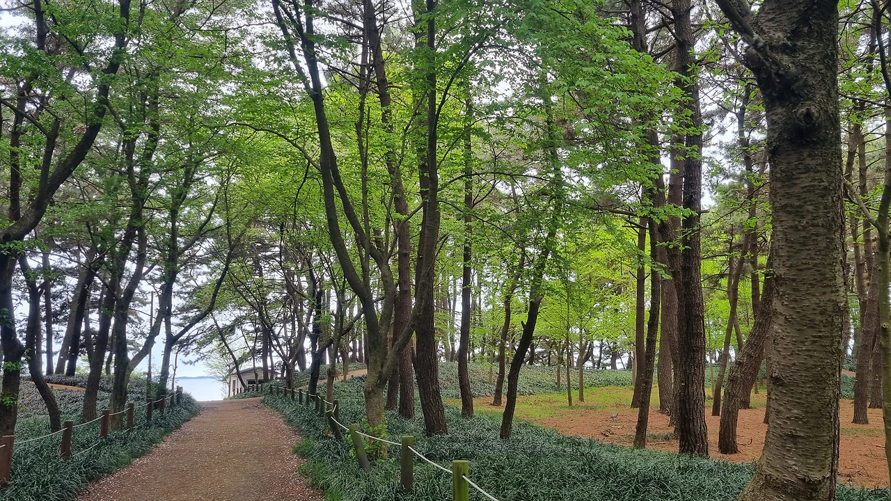 맨발로 걸은 뒤 운동화 신어본 사람은 알 거다. 발이, 몸이 얼마나 가벼워지는지. 깃털처럼 가벼운 몸으로 다시 솔밭길을 걸었다. 이제 막 잎을 틔운 은행나무가 눈부시다. 냄새가 고약한 은행나무의 여린 잎이 이렇게 예뻤던가. 짙은 초록의 소나무 사이로 은은하게 빛나는 은행나무의 존재를 홀리듯 본다. 이 길이 끝나고 있다. 아쉽다.