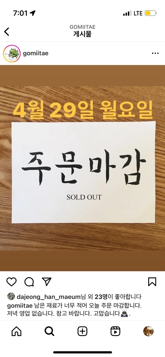 인스타그램 확인 필. 재료 소진되면 허탕.