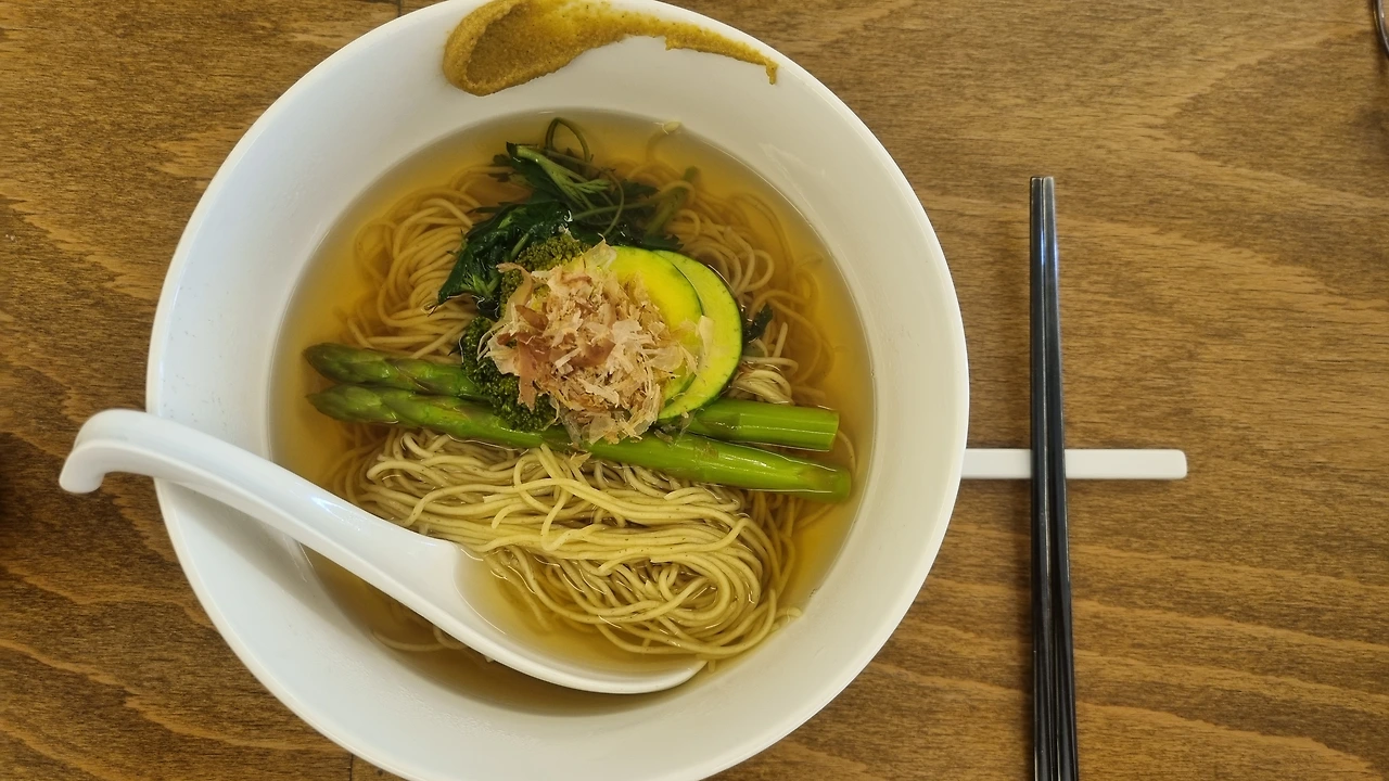 사발에 국수를 펴듯 담고 따로 끓여낸 국물을 부었다. 면 위로 데친 아스파라거스, 브로콜리 두 쪽, 애호박 두 쪽, 쑥, 가쓰오부시를 소담하게 얹는다. 사발에 그림 그리듯 겨자 발라주는 것도 재밌고. 마지막 이제 진짜 디테일이 다른 하나인데, 국물 스푼을 뜨거운 물에 한번 담갔다 주시더라. 마치 국밥 토렴 하듯이. 손길이 섬세하다. 손길만큼이나 서비스도 그렇다. 별도의 반찬은 없다.