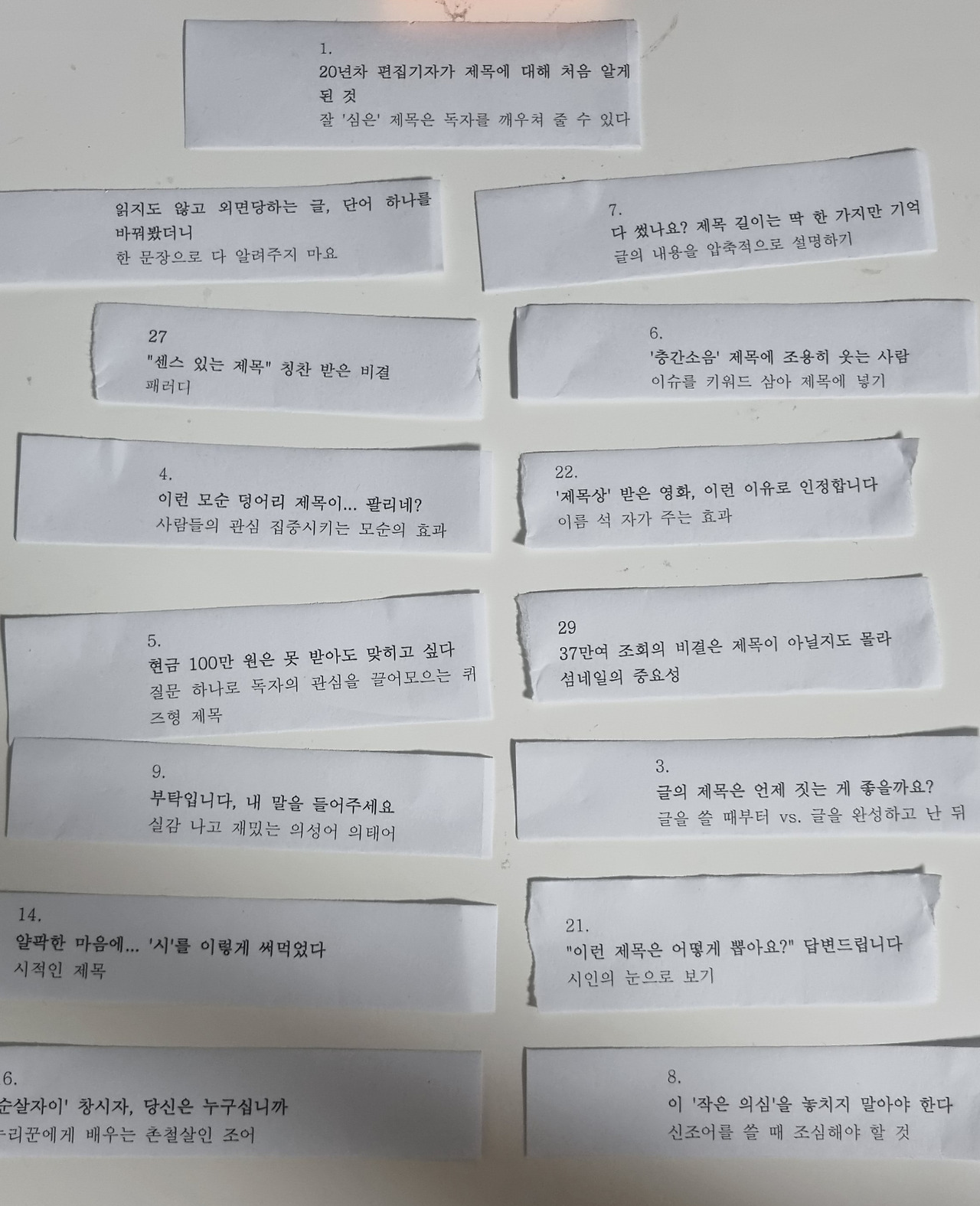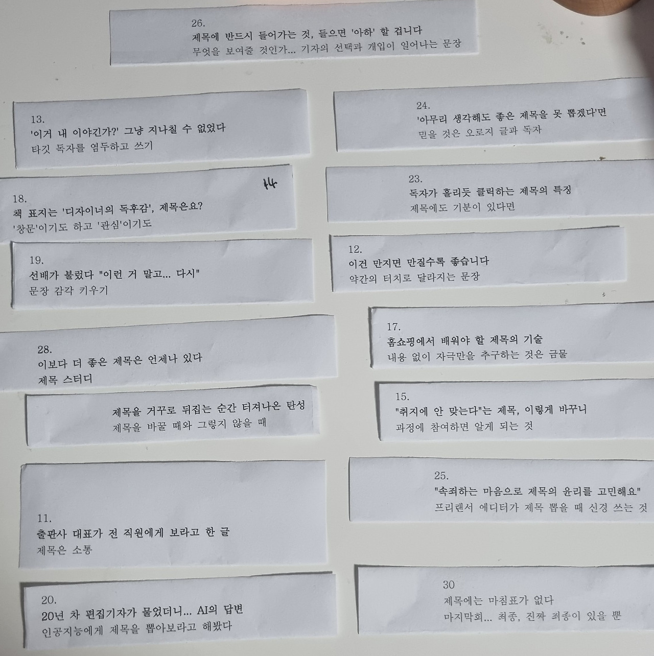 제일 먼저 목차를 프린트했다. 그리고 칼로 죽죽 그어 잘랐다. 나 이런 거 좋아하는 사람이었지. 한글파일에서 오려두기, 붙이기로 할 수 있는 작업이지만 뭔가 이런 쓸데없이 보이는 일이 당길 때가 있다. 물론 하다 보면 전혀 쓸데없는 일이 아니지만.