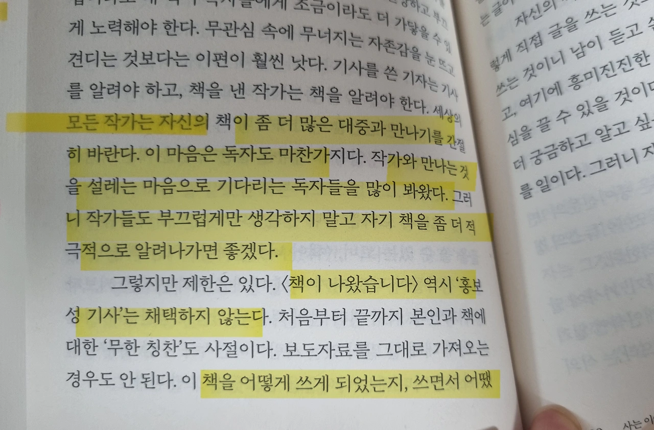 그래도 그렇지, 자기 책에 대해서 어떻게 쓰냐고? 그렇지 않다. 알려야 한다. 글을 쓰든, 강연을 하든, 인터뷰를 하든 한 번이라도 더 독자들과 만나야 한다. 민망하고 부끄럽더라도 내 책이 독자들에게 조금이라도 더 가닿을 수 있게 노력해야 한다. 무관심 속에 무너지는 자존감을 눈 뜨고 견디는 것보다는 이편이 훨씬 낫다.