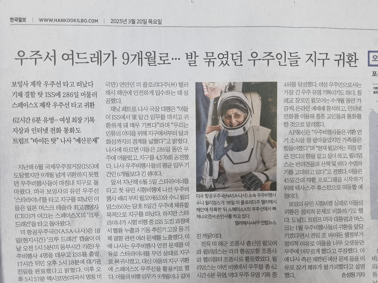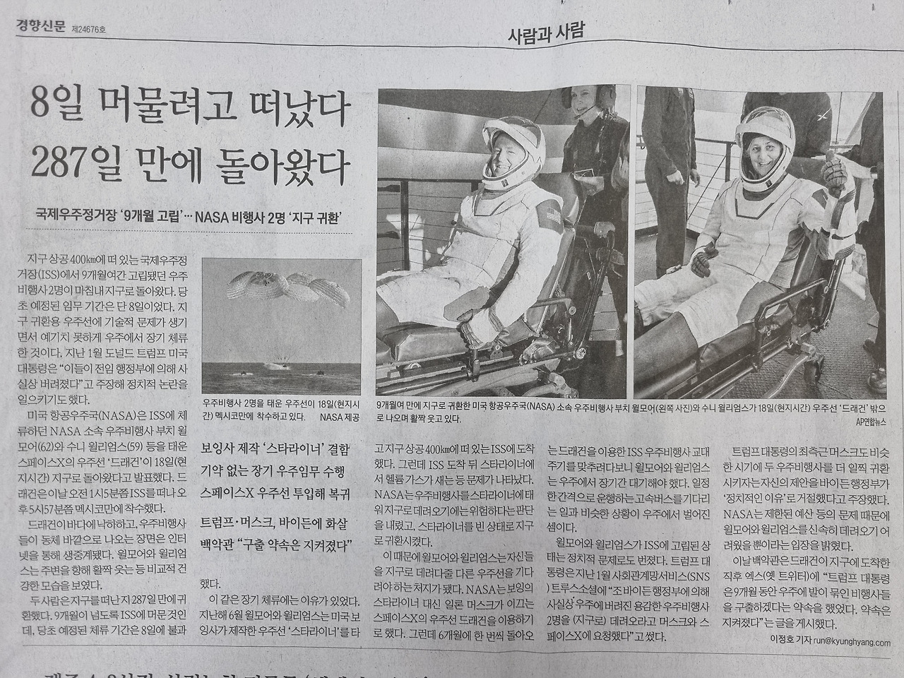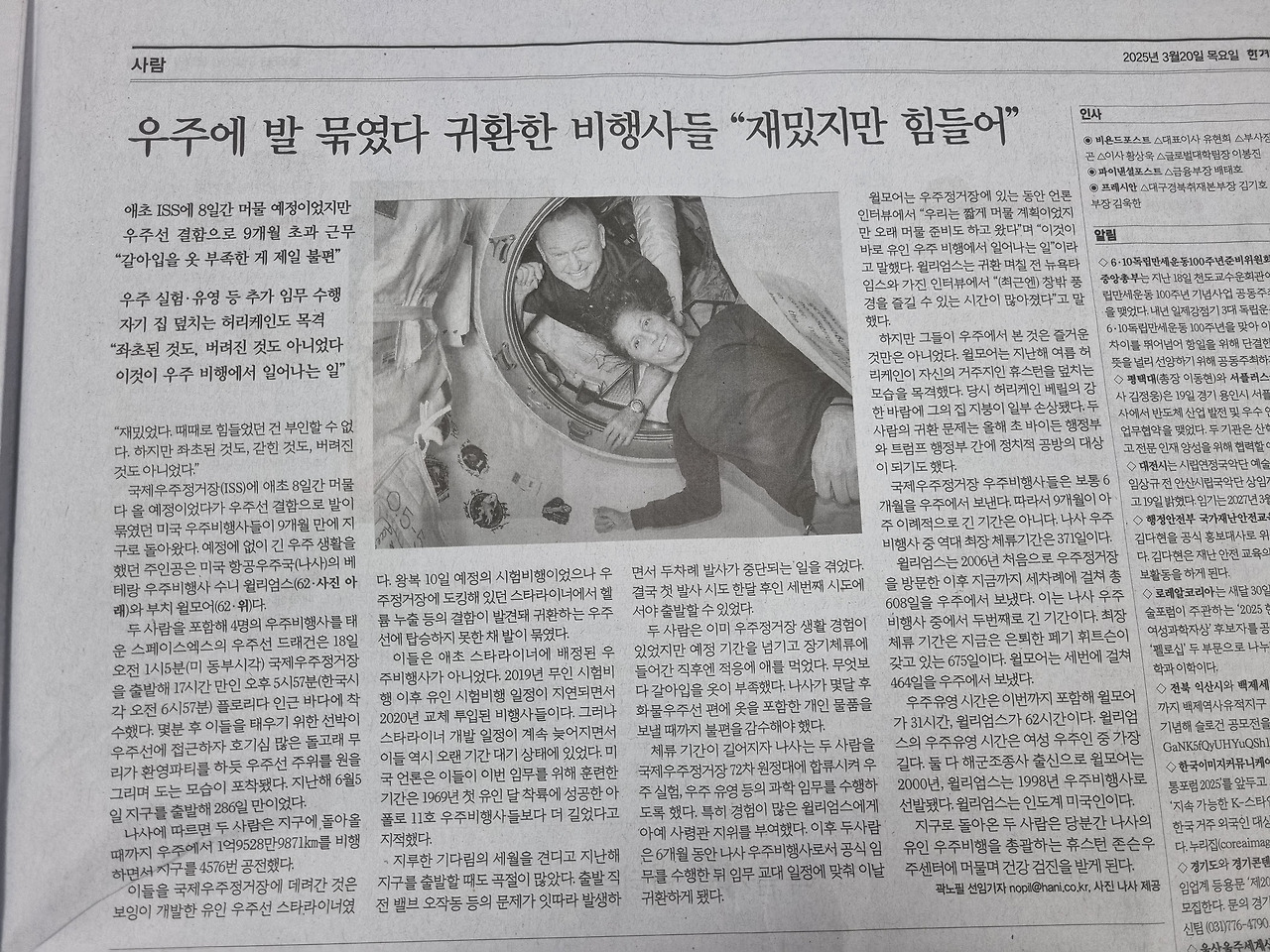 앞 기사에서 '우주에 발 묶였다 귀환'이라는 문장을 먼저 봐서 그런지 새로울 건 없었다. 근데... 정말 재밌었을까? 8일 출장가려다가 9개월 넘게 있었는데... "힘들었지만 재미있었다"도 아니고.