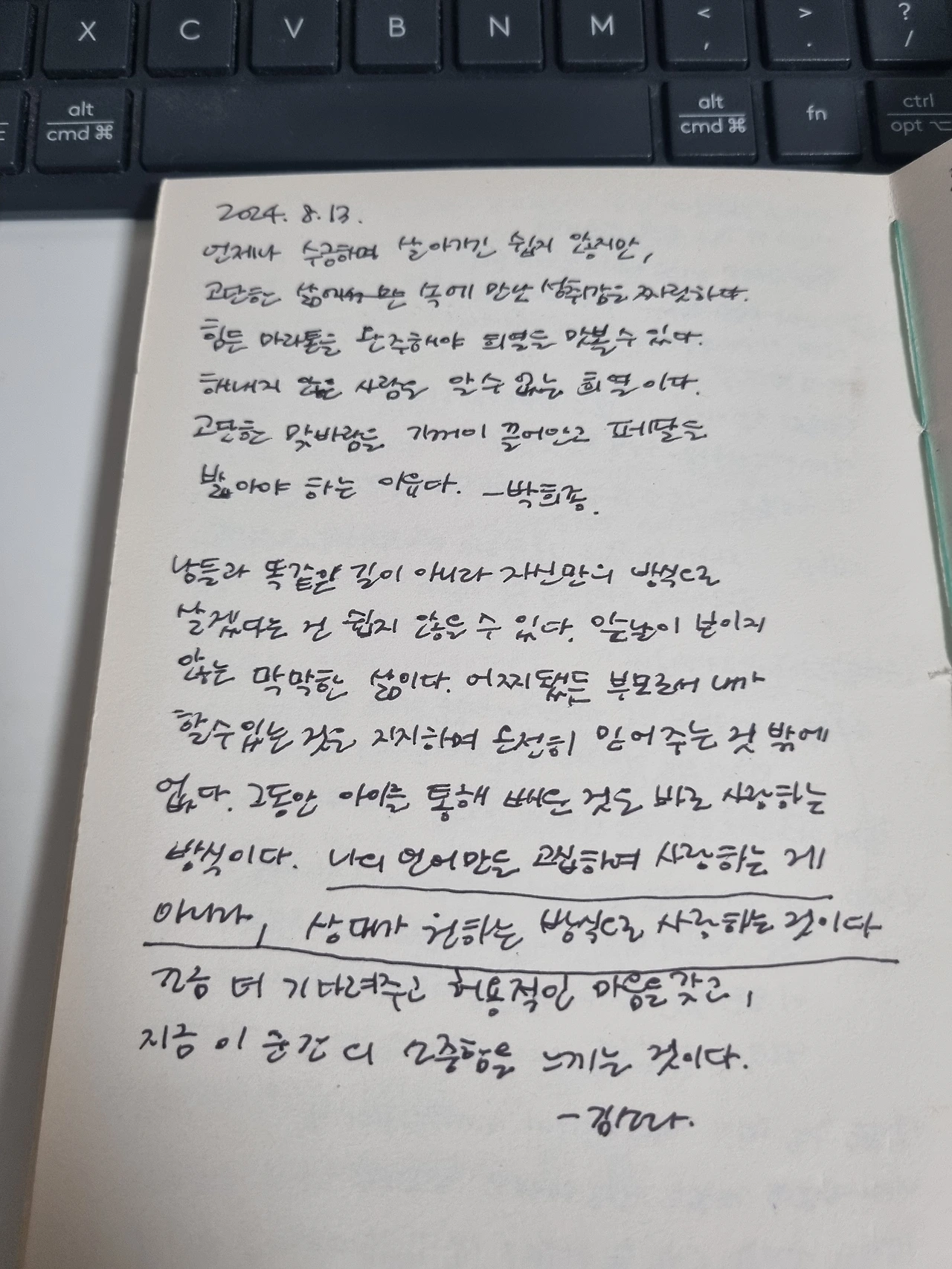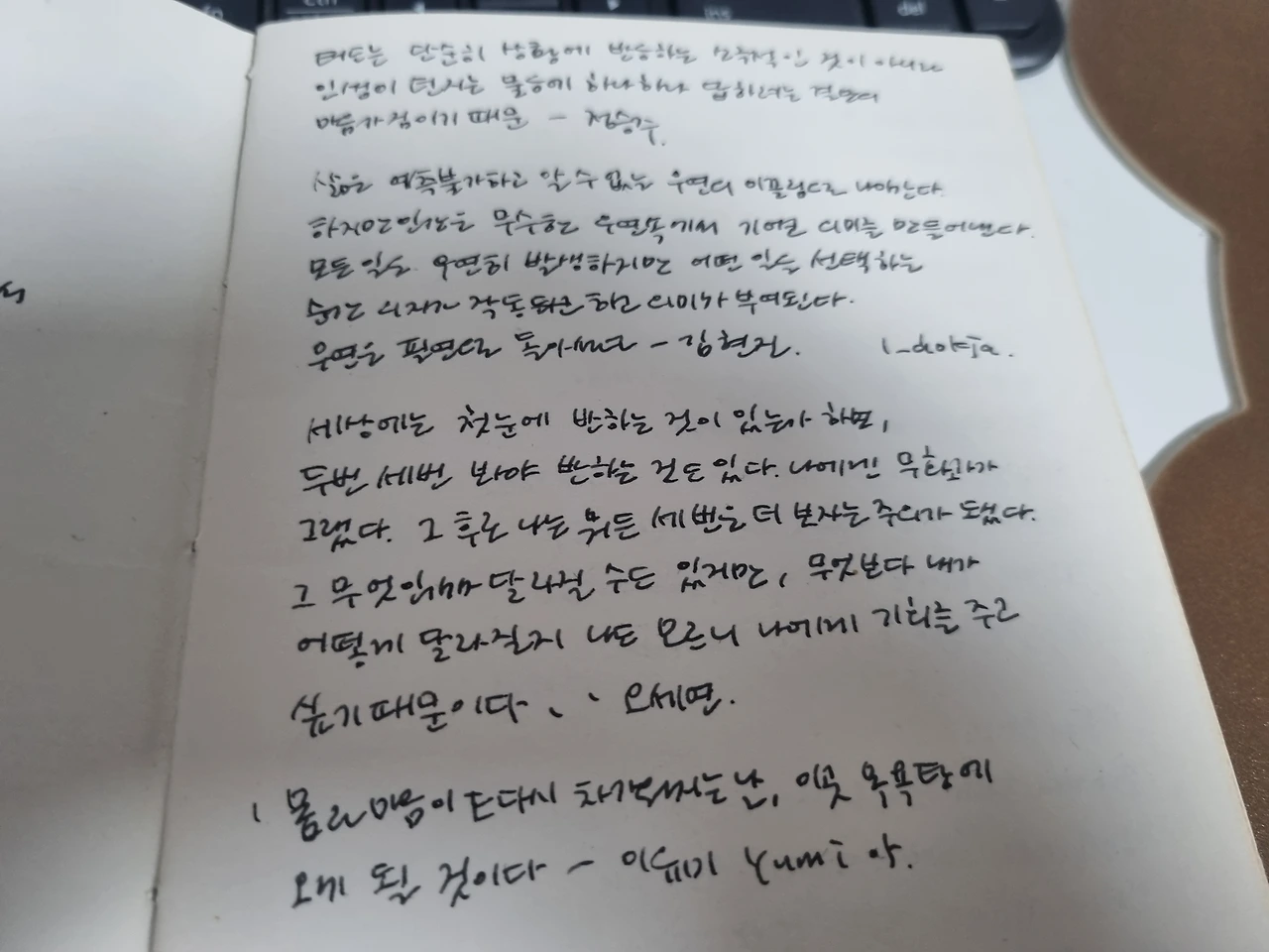 꾸준히 매일 하면 좋겠지만 사실 일을 하다가 갑자기 필사를 하기란 쉽지 않고, 일을 끝낸 후에 하기도 쉽지 않다. 드문드문 그럴 여건이 되고, 그럴 만한 글이 보이면 적어두려고 애를 쓸 뿐. 그래도 이 일을 하는 한은 계속 적을 것이다. 지혜로운 문장가는 언제나 등장하는 법이고 당신에게 공감하는 그 단 한 사람이 나라고, 그러니 계속 쓰라고 말해주고 싶으니까.