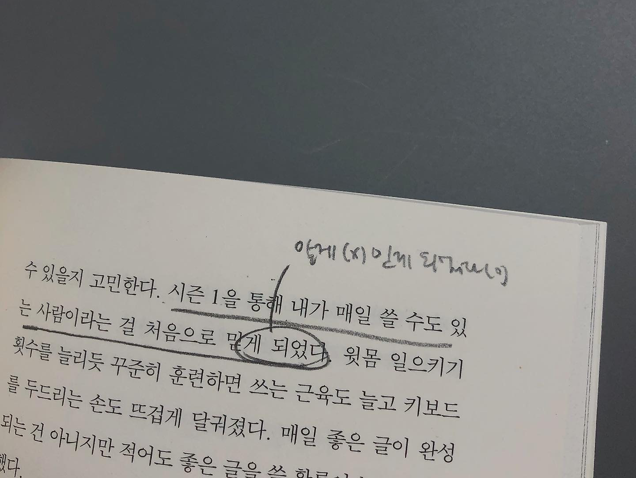 두 번째는 나와 다른 것. 만약 내가 사진에 있는 문장을 썼다면 분명 ‘알게 되었다’라고 쓸 것이다. ‘알다’는 즐겨 쓰는 단어 중 하나이기 때문이다. 알다, 깨닫다, 나의 지적 세계를 확장시키는 듯한 단어가 좋다. 그런데 이슬아는 왜 ‘믿다’라는 단어를 선택했을까? 아니, 애초에 나는 왜 ‘알다’라는 단어를 그리 즐겨 쓴 걸까? 내가 아는 건 맞는 걸까?