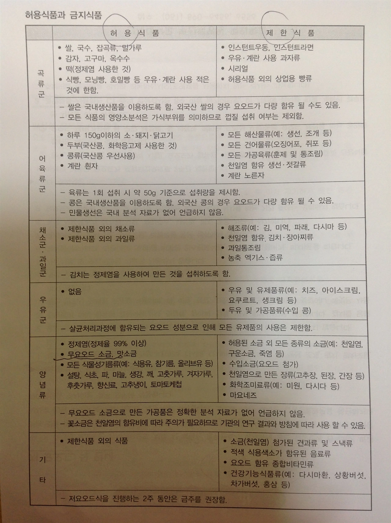 ▲ 저요오드식 허용 식품 목록 방사성 요오드 치료를 위한 저요오드식에 대한 허용 식품 목록