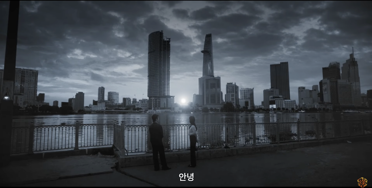 이 영화의 결말부입니다. 한때 연인이었던 자들이 언제 다시 만날지도 모르며 타국에서 안녕을 나누는 장면이죠. 그렇지만 이 장면에서 너무나 아쉬웠던 건 스크린에 중심부에 시각 정보가 몰빵된 느낌이 있다는 것입니다. 고층 건물들과 흑백으로 인해 색감도 완전하지 않은데, 아무래도 시각 정보가 너무나 많다 보니 관객의 시선은 어디 하나 집중할 곳을 찾지 못하거든요. 그렇기에 이 숏이 너무나 아쉬웠습니다. 물론 감독님의 의도는 보였어요.