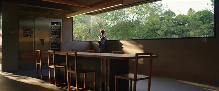 그렇지만 <어쩔수가없다>는 정반대입니다. 이 세계와의 몰입을 최소화하는 광각 렌즈의 왜곡을 사용했죠. 배럴 디스토션 (Barrel Distortion)이라고 부르는, 인물의 배경이 볼록하게 보이는 왜곡입니다. 잘못 찍으면 배경이 너저분한 느낌을 줄 수 있지만,