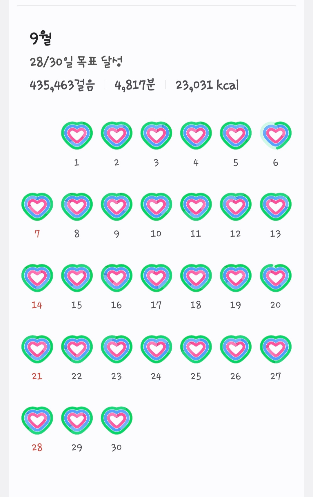 이제라도, 날씬하고 탄탄해진 외형에만 집중하느라 미처 돌보지 못했던 나의 진짜 몸을 제대로 챙기리라 다짐해 본다. 열흘 간의 긴 연휴 동안은 온전히 쉬면서 내면을 가다듬고 충전하는 시간으로 삼아 봐야지. 매일의 헬스 기록을 가득 채우려던 하트 욕심은 좀 내려놓고, 10월의 절반은 휴식하고 회복하는 시간으로 빼곡히 채워보려 한다. 운동 강박을 내려놓으니 반대급부로 등장한 독서 강박. 왠지 다음 병원은 침침해진 눈을 들여다보는 안과를 가게 될 것이라는 슬픈 예감이 스멀스멀 밀려온다.