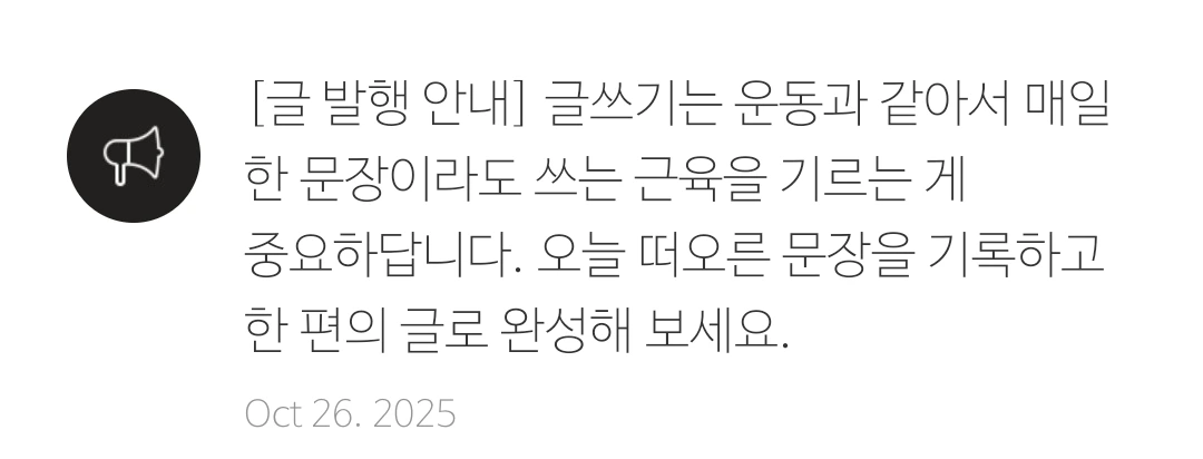 글을 쓰다가 문득, 며칠 전 브런치스토리의 알림이 생각났다. 글쓰기도 운동이라 했으니, 몸의 근육뿐만 아니라 '쓰는 근육'을 늘리기 위해 별일 없는 일상의 심심한 글이라도 어쨌거나 계속 써나가야겠다.