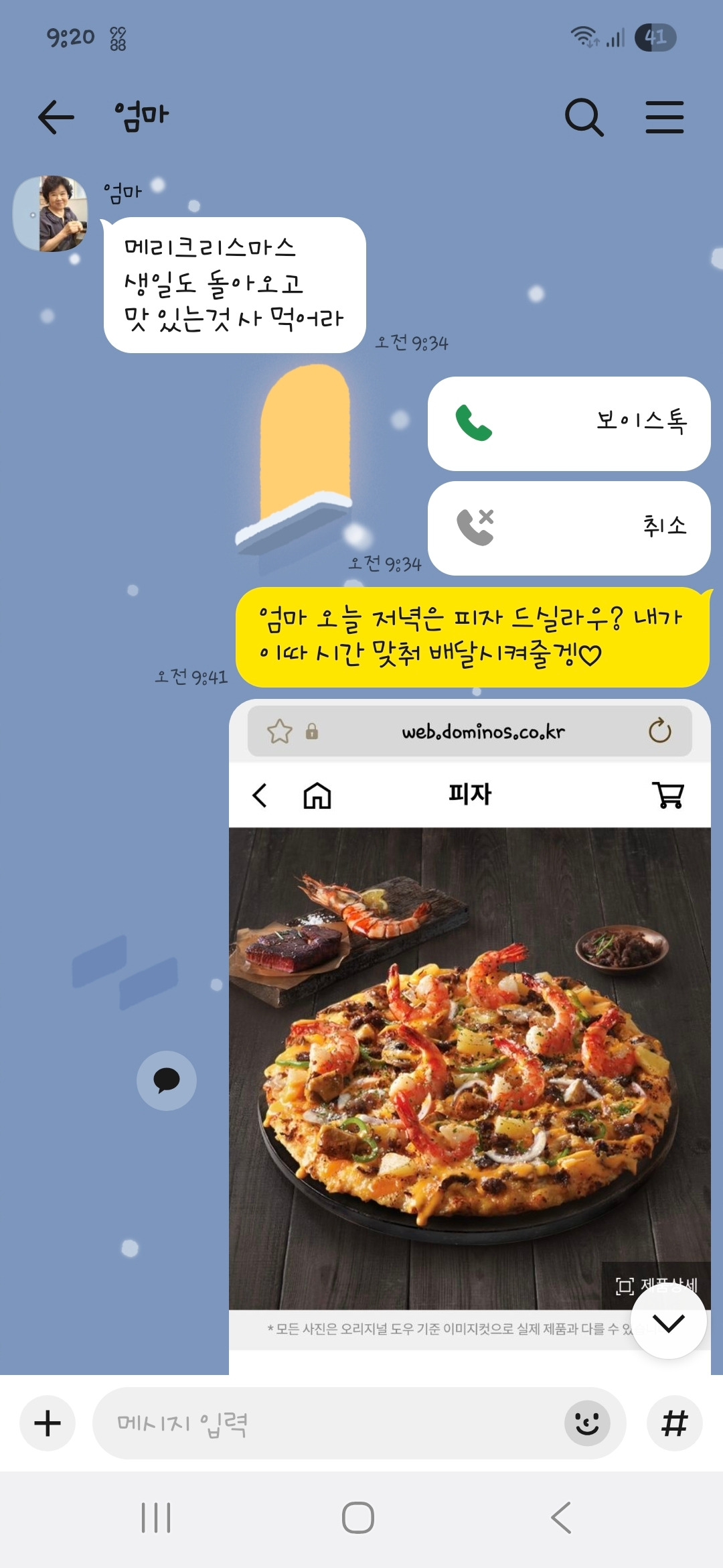 크리스마스이브건 뭐건, 그저 있는 것으로 똑같이 저녁을 드실 두 분의 모습이 떠오르던 순간에 엄마의 문자를 본 순간 각성했다. 거창하지 않아도 돼, 그냥 내가 할 수 있는 거를 하면 돼. 그때 떠오른 것은 도미노피자. 엄마아빠는 나이가 무색하게 여전히 맥도날드 토마토베이컨디럭스 버거와 도미노피자를 좋아하신다. 요즘에는 모든 배달이 모바일로 이루어지니, 자식들이 와서 같이 시켜 먹지 않는 한 피자도 먹기가 쉽지 않으셨을 것이다.