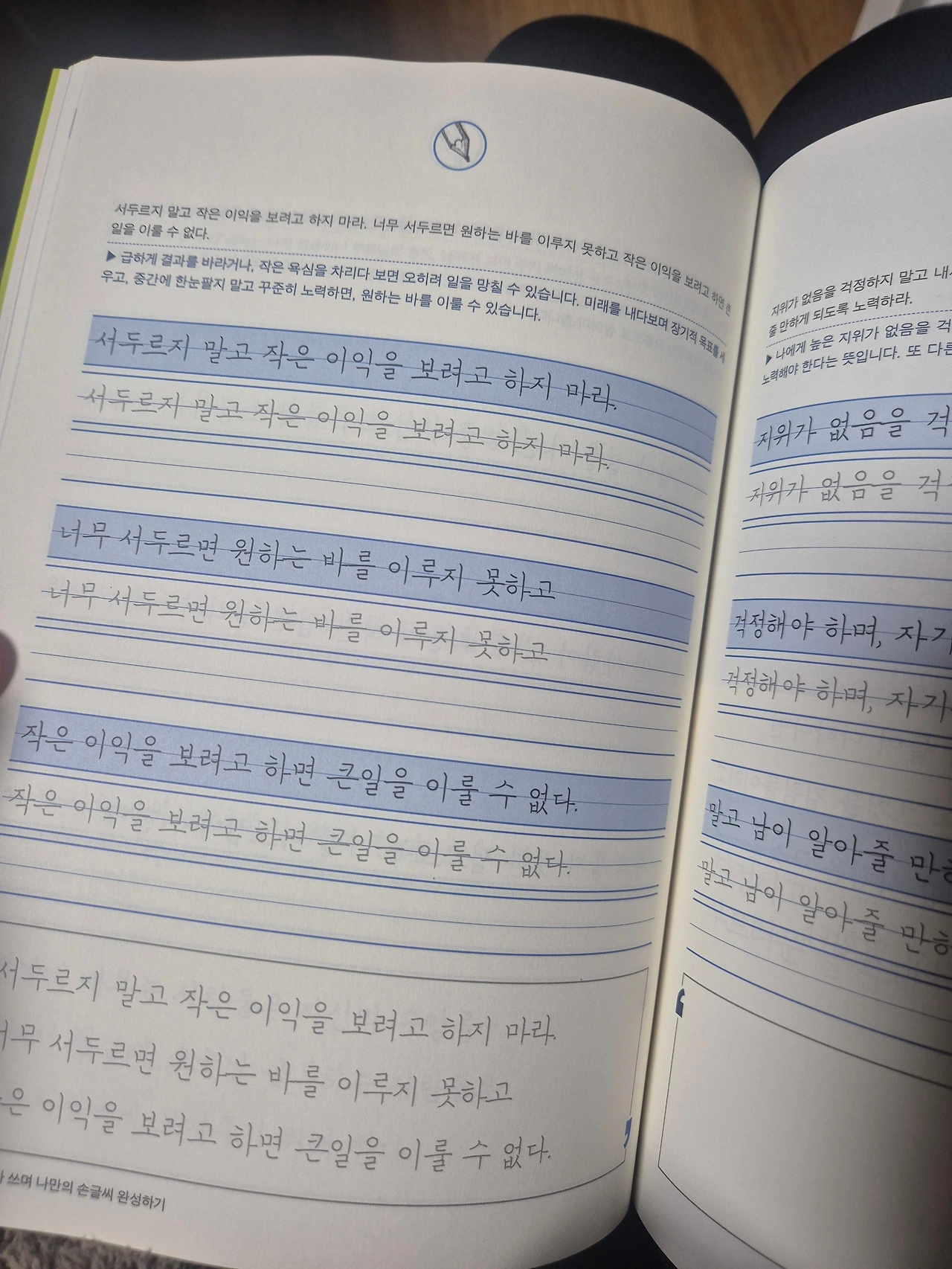 서가에서 여러 책들을 하나하나 펼쳐 보며 고르다가 선택한 것은 <악필 고치는 손글씨 연습>. 사실 제목보다 부제가 더 매력적이었다. '심한 악필: 믿음직하고 단정한 글씨'. 남편은 자신이 심한 악필까진 아니라며 사기를 주저했지만, 예쁜 글씨는 나중 문제고 일단 제대로 쓰는 게 먼저라며 남편을 설득했다.