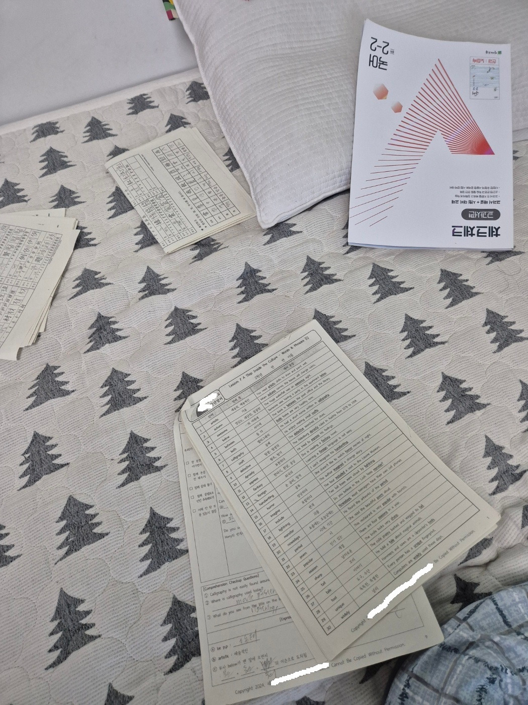 책상 정리는 기본이요, 때마다 맛있는 식사와 간식, 스케줄러와 암기용 체크펜도 들이밀고, 제각각 널브러진 학습지도 모아 챙겨주고, 시험 범위를 안내한 가정통신문도 책상에 붙여줬다. 가장 잘 보이는 자리에 과목별 문제집을 사다 배치하고, 과목별 공부 진도를 체크했다. 사회, 한문 등의 암기 과목 공부는 어떻게 하는지 30년 전 노하우도 자랑했다.