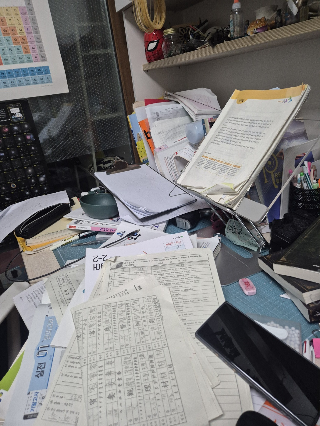 첫 시험을 치른 이후 아들이 뭔가 다른 공부법을 찾았나 기대했지만 그다지 눈에 보이는 건 없었다. 여전히 프린트는 너울너울, 교과서는 너저분 하지만 수업시간에 집중하고 제 공부를 하려고 하는 그 모습에 칭찬하기로 했다. 저보다 잘하는 친구들을 보며 건강한 자극을 받고 용기를 내는 태도에 박수도 쳐 주었다.