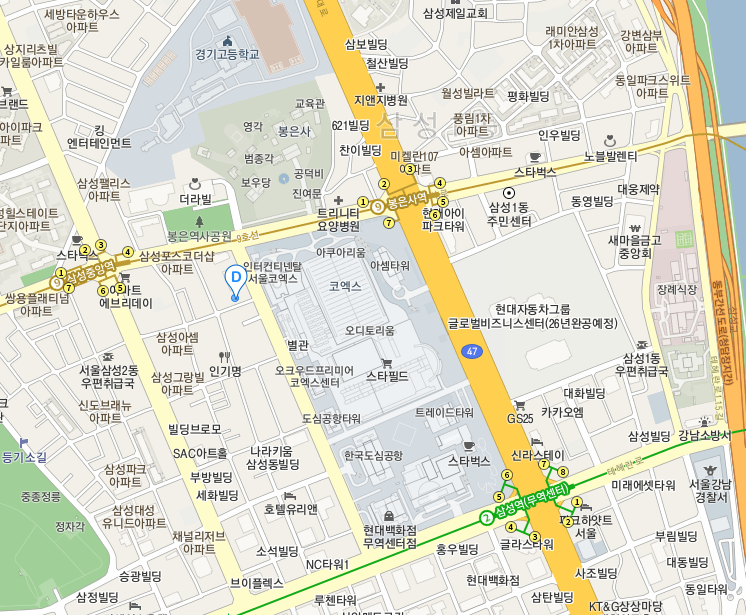 입지조건이 굉장한 곳에 위치하고 있다. 바로 앞에는 인터콘티넨탈 호텔이 있고, 봉은사가 있고, 코엑스가 있고 세븐럭 카지노가 있고, 추후 지어질 현대자동차 글로벌 비즈니스센터가 있다.
