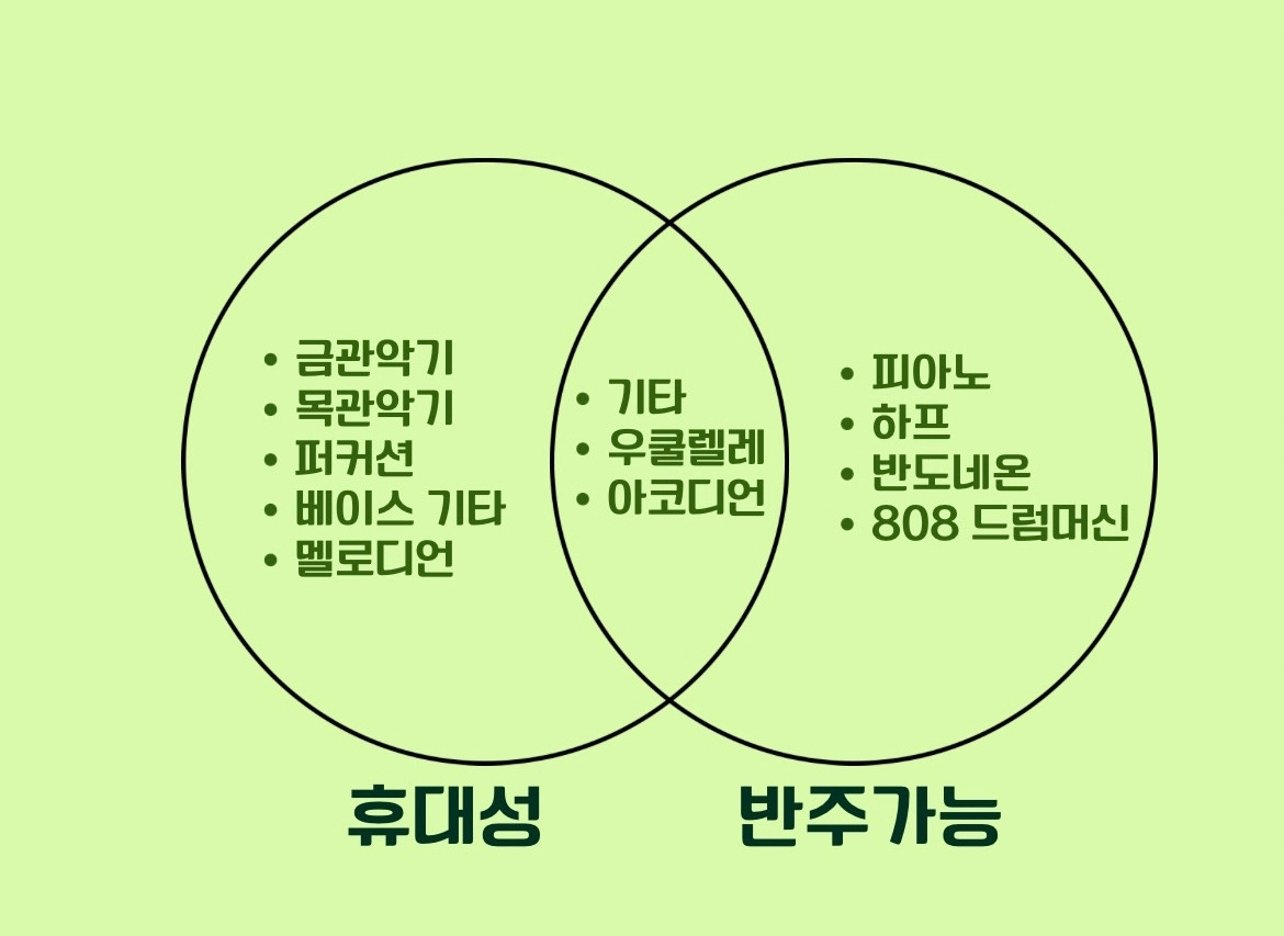 저 두 가지 조건을 만족하는 악기가 그렇게 없을까? 싶지만 연주를 하면서 노래를 부르는 것이 불가능한 관악기는 모두 제외되고, 전통적인 반주 악기인 건반악기는 휴대성에서 제외됩니다.(멜로디언의 경우는 휴대는 가능하지만 입을 사용해야 하기에 마찬가지로 제외됩니다.) 게다가 일반적으로 밴드 음악에서 다른 악기와 함께 연주되는 베이스, 일렉기타 등을 제외하면 정말로 남는 악기는 기타, 우쿨렐레뿐입니다. (대중적이지 않은 악기를 굳이 포함시키자면 아코디언 정도를 추가해 볼 수 있습니다.)