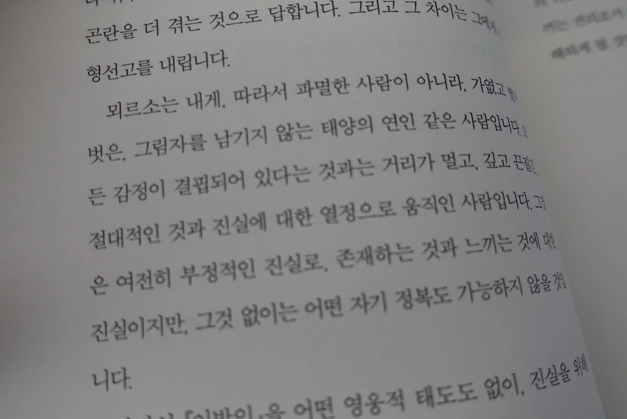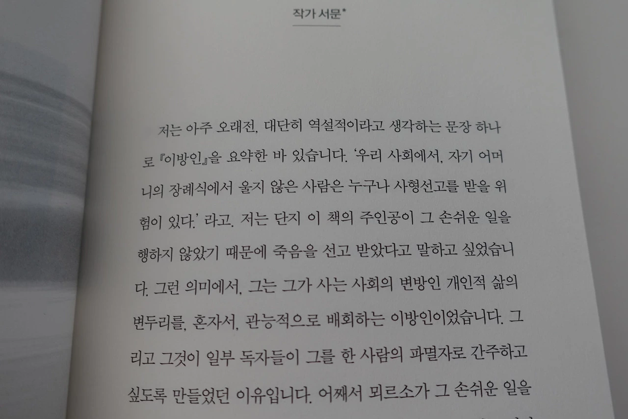 L'étranger, 이방인이라고 불리는 이 프랑스어 단어. 사전으로 검색해 보면 외국인을 뜻하는 단어라 검색이 나온다. 옛날에는 외국인을 이방인이라 불렀단다. 같은 뜻을 지닌 단어라고 해도, 파란 눈의 외국인과 노란 머리 이방인의 뉘앙스는 조금 다르다.'이방인'이라는 단어에는 뭔가 부정적인 시선이 한 방울 들어간 느낌이랄까. 이방인이라는 제목이 어찌 보면 특별할 것 없이 평범하게 느껴질 수도 있겠지만, 알베르 카뮈의 작품이라고 하면 다시 한번 혹시 제목에 다른 의미는 없을까 생각하게 되는 것이 명작의 힘이 아닐까 싶다. 솔직히 고전소설은 어렵고 따분하다. 그러나 매번 읽을 때마다 그 느낌이 다른 것은 어찌 설명할 수 없는 고전만의 매력이 아닐까.