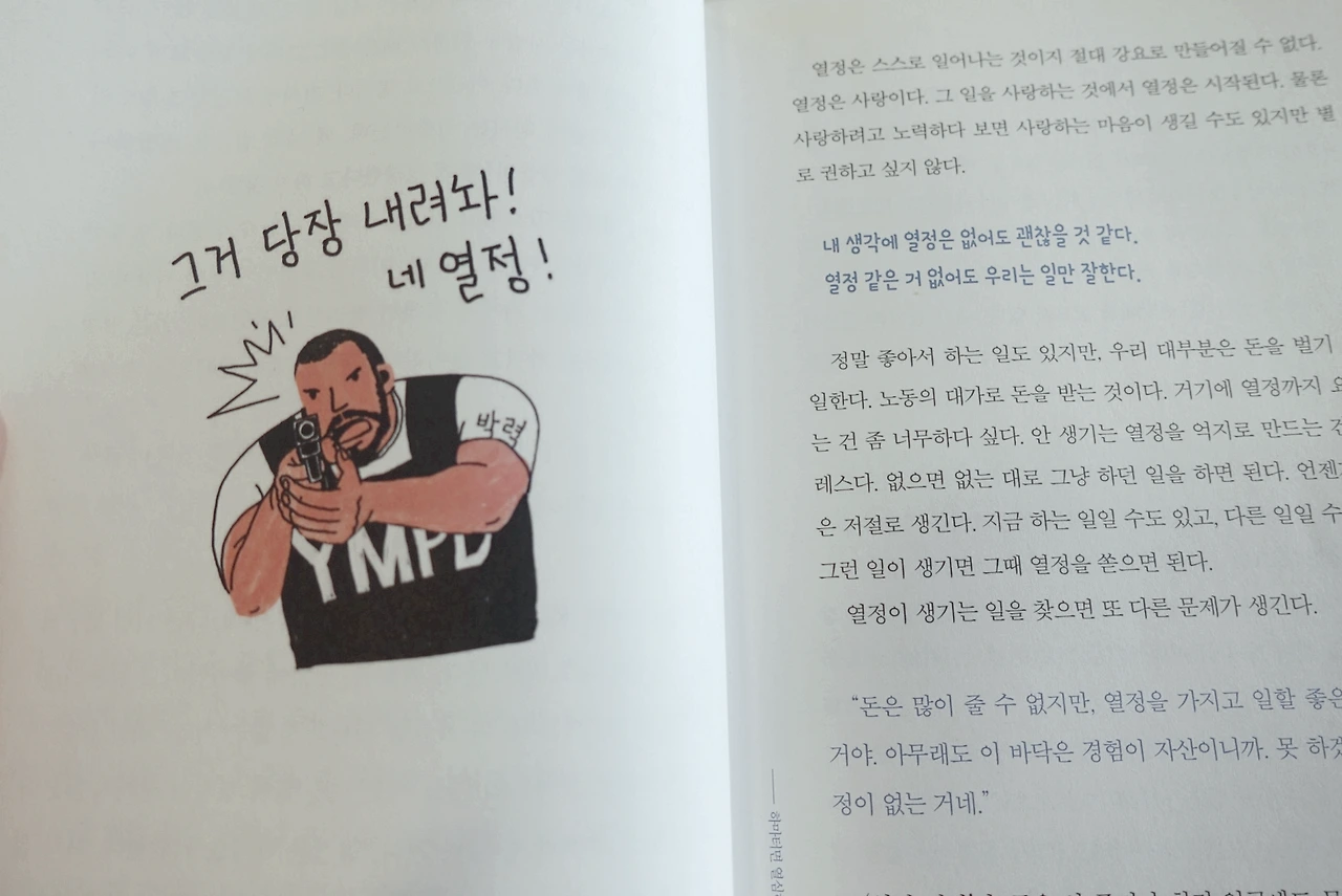 지는 게 싫어서 열심히 살지 않기로 했다는 작가. 그의 득도에 절로 웃음이 지어졌다. 뭐, 조금 걱정이 되는 건 사실이지만 어떻게든 되겠지. 라며 케세라세라(Que sera Sera)를 외치는 그를 보니 마음이 좀 홀가분해지는 건 왜일까? 회사를 다니다 보면 종종 열정을 다해 일하라며, 독려를 받는다. 하지만 열정을 강요받는 느낌이 불편하기도 하다. 그는 말한다. 열정도 닳는다고. 함부로 쓰다 보면 정말 써야 할 때 쓰지 못하게 된다고. 언젠가는 열정을 쏟을 일이 찾아올 테고 그때를 위해서 열정을 아껴야 한다고. 나도 이제부턴 조금 열정을 아껴 써야겠다.