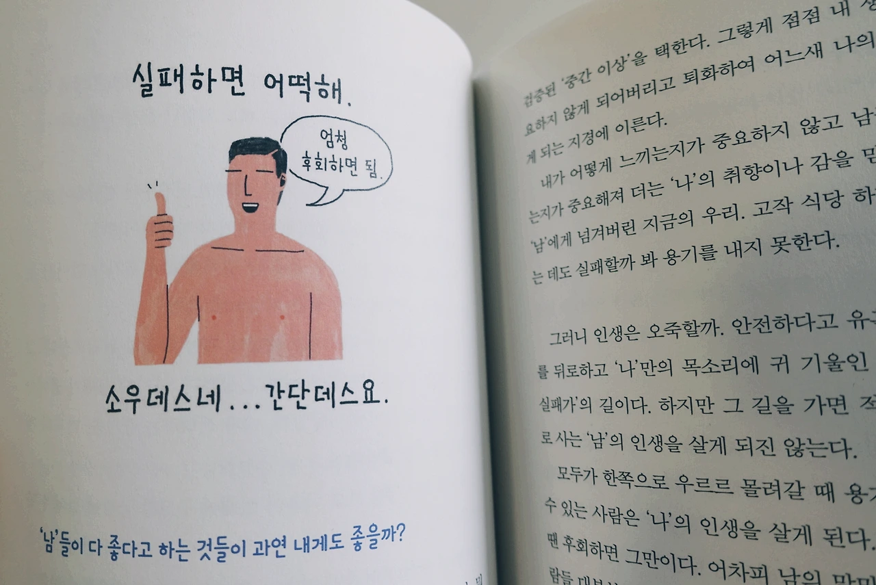 작가는 말한다. "많은 사람들이 좋다고 하는 것은 확실히 실패할 확률이 낮다. 뭐랄까, 중간 이상은 한다는 느낌이랄까? 하지만 나에게 딱 맞는다는 느낌을 받기는 어렵다. 그럼에도 우리는 검색을 한다. 실패하고 싶지 않아서다. 나에게 딱 맞는 것을 찾아 도전하고 위험을 무릅쓰기보단 실패하지 않을 검증된 '중간 이상'을 택한다. 그렇게 내 생각이나 감각은 중요하지 않게 되어버리고 퇴화하여 어느새 나의 선택을 믿지 못하는 게 되는 지경에 이른다. 고작 식당 하나, 영화 하나를 고르는 데도 실패할까 봐 용기를 내지 못하는데, 인생은 오죽할까. 모두가 한쪽으로 우르르 몰려갈 때 용기 있게 다른 길을 선택할 수 있는 사람은 '나'의 인생을 살게 된다. 실패해도 좋다. 실패했을 땐 후회하면 그만이다. 어차피 남의 말만 듣고 우르르 몰려갔던 사람들 대부분도 후회하긴 마찬가지다. 안 그런가? 실패를 두려워 말자."