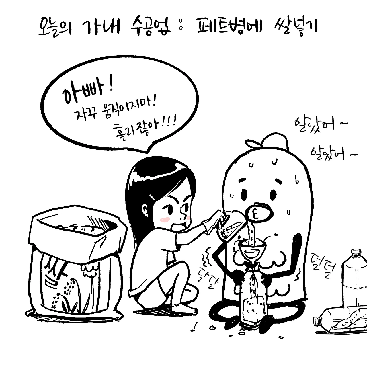 한 달에 한번 마트에서 쌀 20kg짜리를 사 오는 날이면깔때기를 끼고 앉아서 쌀을 패트 병으로 옮기는 일을 합니다아이들은 이 귀찮은 작업이 재밌어 보이는지“나도 같이 하자~”하고 달려듭니다.요즘엔 깔때기를 사용하는 일이 일상에선 좀처럼 없으니마치 과학 실험을 하는 기분인가 봅니다.