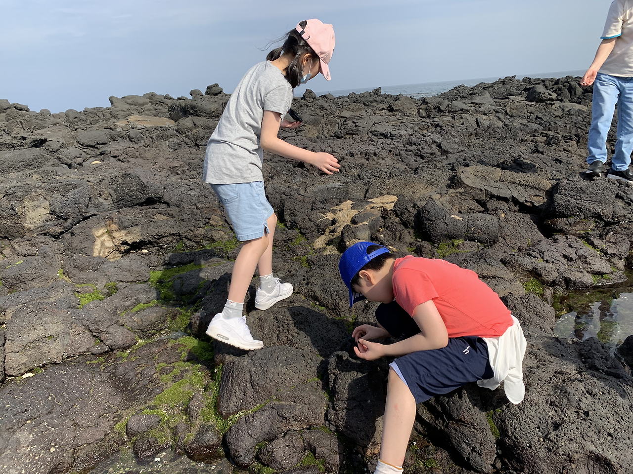 제주의 검은 바위 해변에는 보말이 지천에 널려있다. 관광객 채취를 허용한 이곳 어촌계 덕에 좋은 경험을 할 수 있었다. 바닷물이 빠진 간조시간에 맞춰가면 쉽게 보말을 딸 수 있다. 관광객이 줄어서 그런지 제법 큰 보말 들을 쉽게 찾을 수 있었다. 손주들은 보말 군집도 살펴보고, 움직이는 모습에 놀라기도 하고, 조심스럽게 잡아보기도 하고, 놓아주기도 하면서 즐겁게 시간을 보냈다.