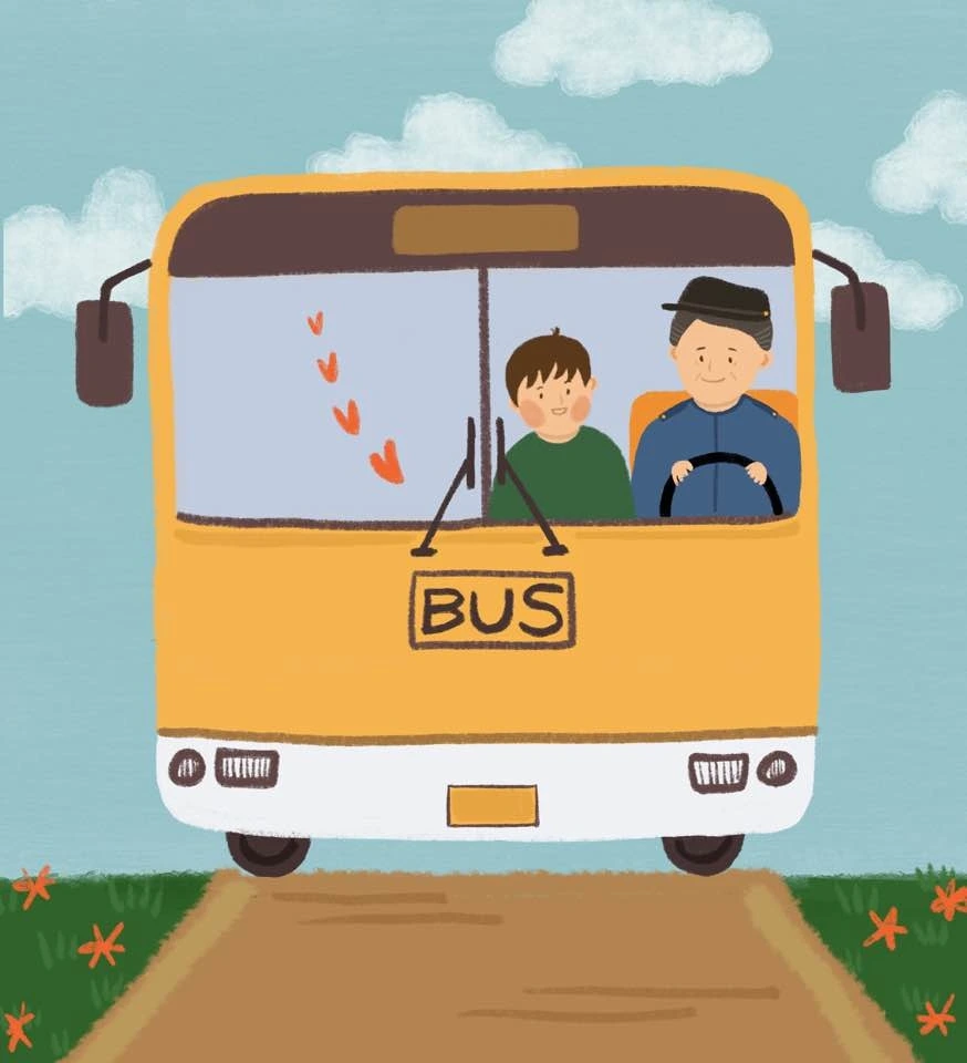 꼬마 아이가 운전기사의 팔을 붙잡고 서 있다.