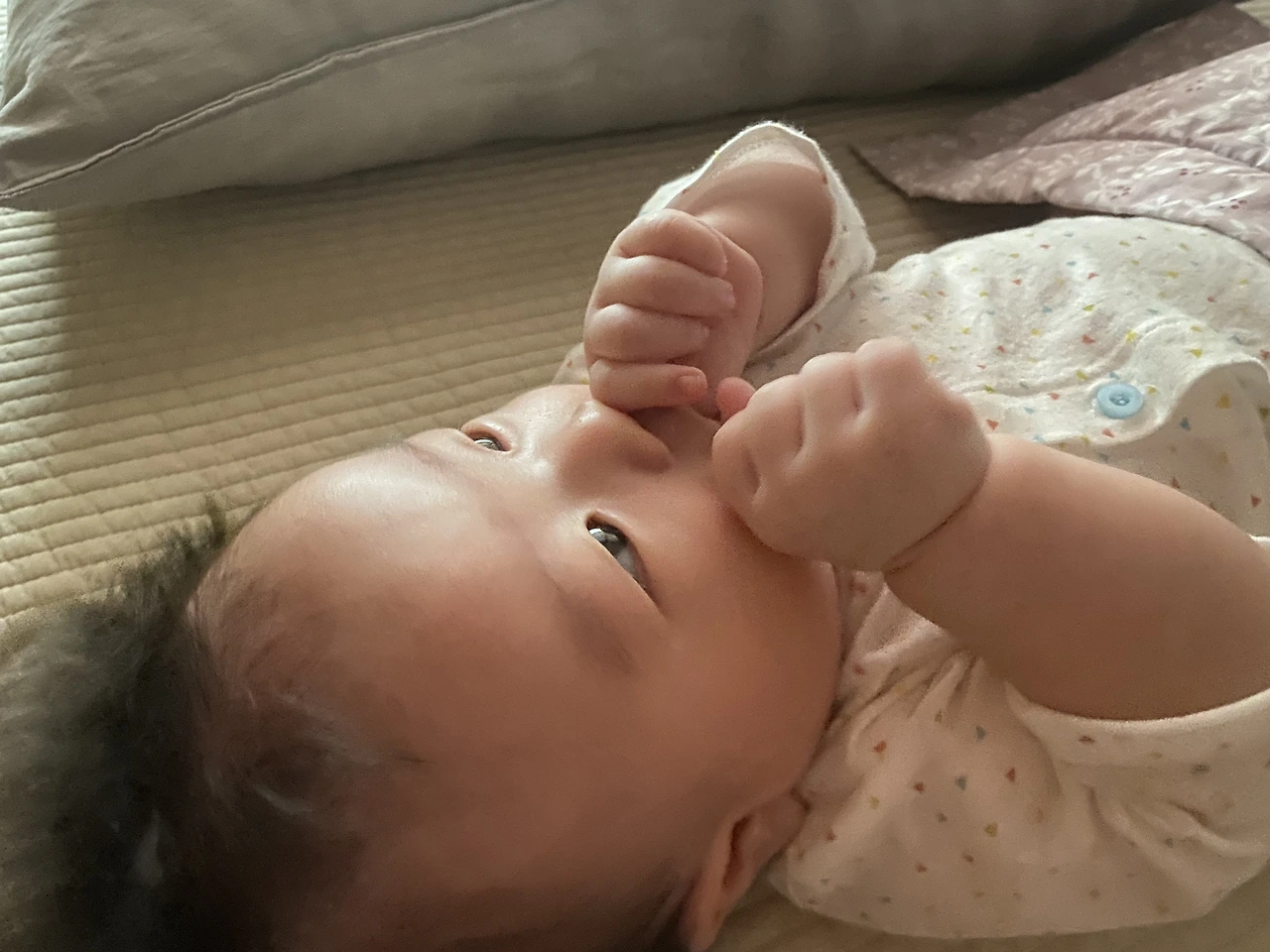 혼자 누워있다가도 이내 왼손을 번쩍 들어 손을 얼굴의 한 부위에 접촉시킨 다음 투박하지만 천천히 입으로 엄지손가락을 끌고 온다.