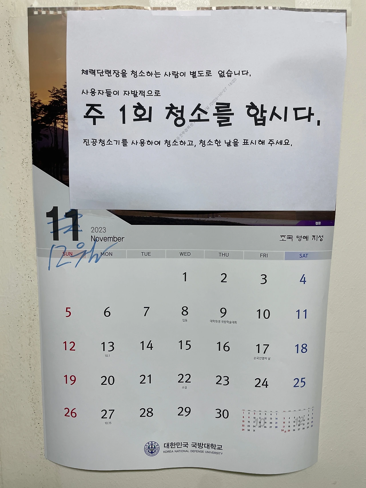 누군지는 확실하지 않지만 예비역 교수님으로 예상되는 분께서 헬스장을 깨끗하게 청소를 하시고는 일주일에 한 번은 누구라도 자발적으로 청소를 하자고 벽면에 적어 넣으신 것이다.