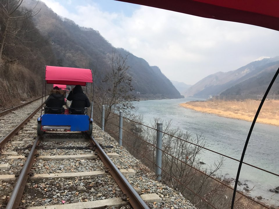 1열 종대로 쭉 늘어선 2인, 4인 열차들이 하나씩 출발한다. 덜덜거리는 기차 바퀴 소리에, 옆에 있는 사람의 목소리가 들리지 않는다. 나만의 기차여행이 시작된 것 같은 기분이 들었다. 끝이 보이지 않는 레일, 하얀 눈이 수북이 쌓인 산, 푸른 북한강은 불과 하루 전 수많은 사람과 빌딩으로 둘러 쌓인 여의도의 퍽퍽한 삶을 까맣게 잊게 한다.